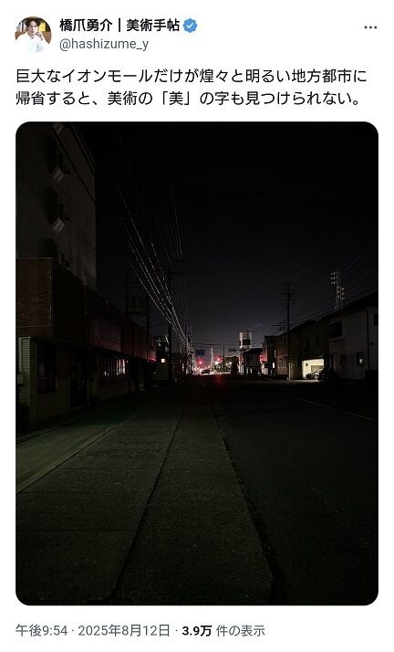 美術手帖の編集長さん、田舎から上京して数ヶ月のイキリ大学生みたいなことを言っていて、もはや微笑ましくて、思わず何歳なのか調べてしまった。年上でびっくりした。 pic.twitter.com/0aubVba3L2 — 吉田裕子(国語講師、三鷹古典サロン裕泉堂の人) (@infinity0105) August 13, 2025 東京にタワマン文学があるなら、地方にはイオンモール文学があるべきではないだろうか。いまだ発見されていない豊かさと美が描かれるべきではないのか。 — ミック (@copinemickmack) August 15, 2025 地方都市には巨大イオンモールしかないけど、東京は美と文化の拠点まいばすけっとがそこかしこに存在する pic.twitter.com/f6FHmzoSEX — 兵務局 (@Truppenamt) August 14, 2025 都心部で近所にあってほしいスーパー偏差値 70:ライフ65:サミット60:オーケー 成城石井55:東急 マルエツ オオゼキ ヨーカドー45:西友 マルエツプチ40:まいばすけっと — ゆな先生 (@JapanTank) August 15, 2025 コンビニ感覚で買い物できるのにスーパー価格で買えるまいばすけっとの何が憎いのか — たっしゅ/多趣味な学生 (@kbm_N1) August 16, 2025 まいばすけっとの何が罰なんだろうと思ってたけどそういう事だったのか。歴史にまたひとつ詳しくなれた。 — 御前のぞむ (@nozomu0321) August 16, 2025 都民への罰は「まいばすけっとしかないこと」ではなく、「近くにちゃんとした規模のスーパーないこと」なので、そこをはき違えないでもらいたい まいばすけっとはその罪を0にはできなくとも軽くしてくれたのですよ — ひらじゃーん@coming soon (@jusco_hiraoka) August 15, 2025 まいばすけっと、便利だし、あれしかない地域では生命線というのもわかるのだが、ほんとに「喜びがないー」なんだよな。大容量で安い肉や魚や野菜、あるいは珍しい肉や魚や野菜をみつけて、どう料理してやろうかとワクワクするような躍動感と遥かに遠いところにある — 在華坊 (@zaikabou) August 15, 2025 東京から田舎に来て、「イオンなんてまいばすけっとの大きい奴だろ」くらいに思ってたのだが、まいばすけっとじゃない部分が随分大きくて驚いたイオンは「必要なもの全部揃えたの」で、まいばすけっとは「これくらいで我慢しろ」なのだよ — 自称おごちゃん (@ogochan) August 16, 2025 こうやって考えると、まいばすけっとはあまりに実用的過ぎるのかもしれない、良くも悪くも遊びがないのかな、だからこそ出店を増やせるわけで — ひらじゃーん@coming soon (@jusco_hiraoka) August 15, 2025 まいばすけっとは自分ちの冷蔵庫の管理を外部委託してるようなものだ。特別感は無いぞ。 — Ʊ ☡ (@hiko_0) August 16, 2025 イオン帝国軍、東京都心には「まいばすけっと」という高時給+均質店舗の格安販売という戦略級超兵器を展開して近隣住民を従えている。 コンビニを大きく圧倒。 どこまで行ってもイオンから逃げられないんだよ。 — 零細不良品★おとんちゃん (@upopoipo) August 14, 2025 仕事に遊びに忙しい23区都民(所得は問わない)に最適化されたスーパーがまいばすけっとである。疲れた都民の少ない認知資源で買い物できる要素があの店舗に詰まっている。 — ゴルシー@「平成」の消滅 (@Merci_mmm) August 15, 2025 コンビニエンスストアが『コンビニエンス』の引き替えに値段に反映してるように、まいばすけっとは『コンビニエンス』の引き替えに品質を代償にしてるんだから、ニーズには合ってる — もちベーコン (@qxqxqxaquas) August 16, 2025 コンビニにスーパー詰め込んだ結果、雑誌とか一番くじとかホットスナックみたいな、なんか別になくても死なないけどあると楽しいものが全部消えたのがまいばすけっとなのだと思う…… — 前島賢(大樹連司):文学フリマ新刊委託中 (@MAEZIMAS) August 15, 2025 まいばすけっと、フルシチョフカの中央にある理想の国営スーパー、ソ連の夢みたいな品揃えみたいな気がしてきた — とろ (@fat_tuna_fish) August 15, 2025 まいばすけっとのお惣菜は社会主義の味がする(婉曲表現) — リヒト (@licht_reman) August 16, 2025 モスクワ郊外に新たに建設された労働者のための新たな団地、その中央に配置された国営食料品店には、生活に必要な物が全て揃っています — とろ (@fat_tuna_fish) August 15, 2025 Source: 市況かぶ全力2階建 投稿ナビゲーション 彼女「結婚したらお小遣い制でいいよね」ワイ「ええでー、月3万くらいでええか?」 川崎鶴見臨港バス、整備士に初の外国人材 フィリピンで採用活動