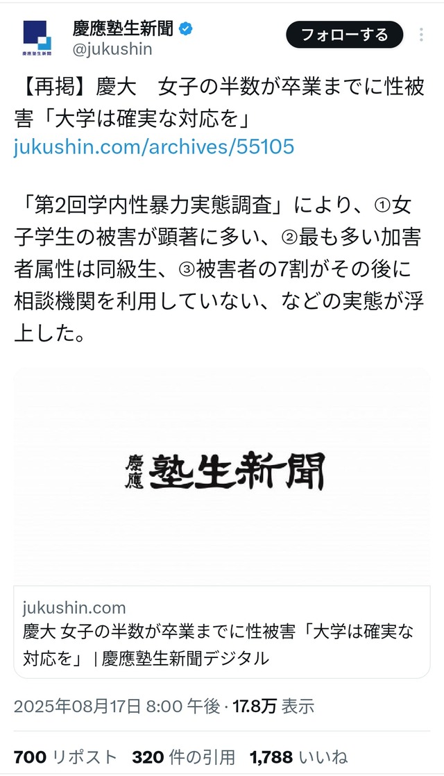 1: ダサブビル(ジパング) [IT] 2025/08/18(月) 10:50:25.53 ID:DrDu6Yrl0 BE:237216734-2BP(2000) 続きを読む Source: 哲学ニュースnwk 投稿ナビゲーション 32歳美人YouTuber「痔だと思って放置してたらステージ4の大腸がん」 【悲報】女さん「夫に“簡単なものでいいよ”と言われて素直に簡単なもの出すのは奴隷女」