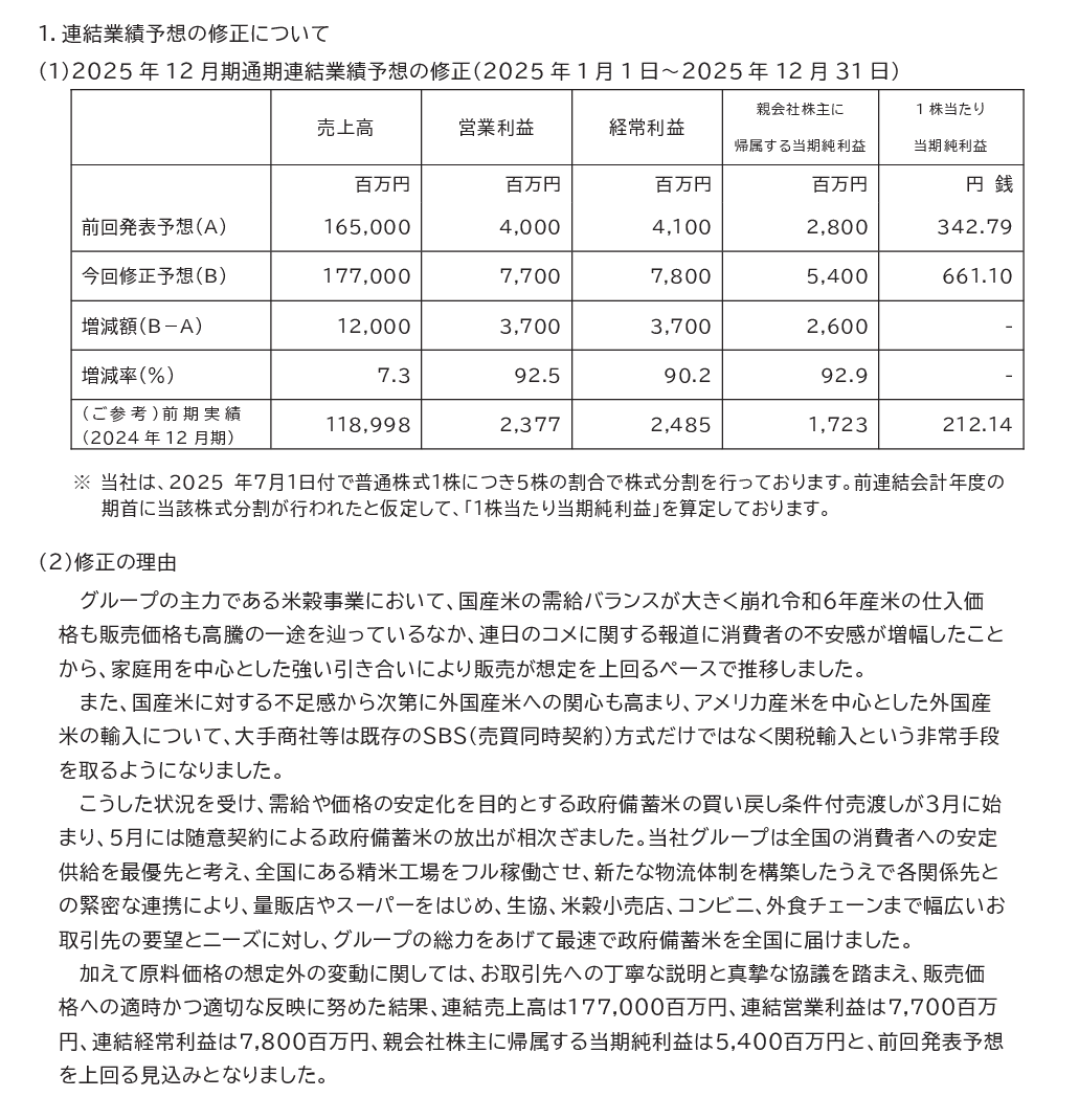 新米5kg7800円って米が主食じゃなくなる可能性出てくる価格だな — trg (@ynn00g) August 17, 2025 https://www.youtube.com/ 「特別栽培米」で「食味ランク特A」って表記されてて5kg7800円って別に妥当な価格でしょ…煽りすぎでは — わ (@_wasaby_) August 17, 2025 近所の店で売られていた鹿児島産こしひかりの新米は5kg4700円?くらいだった。7800円は極端な例だろうけど、4000円は下回らないのでは、という感覚ではある — 在華坊 (@zaikabou) August 18, 2025 食味特Aの特別栽培米の新米、本マグロ初競りのご祝儀相場みたいなやつ? — terazzo (@terazzo) August 17, 2025 コメ先物久しぶりに見たら年初来高値更新してたもう備蓄米という盾もないぞ?https://t.co/PIGKfs5M4x — 競歩くん (@monokorokun) August 12, 2025 農協さんが早生の概算金出してきた。コシヒカリは30キロ11000円越え、イクヒカリすら30キロ10000円越えてきた。就農して20年、こんな数字は初めてだね。初めてのバブル感、お祭り感あるよ! — 田舎の者mo-chan (@moss0782ga) July 17, 2025 うちの地域、備蓄米戦争再びって感じで当日入荷分は夕方までは余裕で残ってた備蓄米が今買い出し行ったら棚がすっからかんになってた。カルローズ米がうず高く積まれてたけど、全然売れてない。 — みんく@ Instinct TL50 (@mink0731) August 18, 2025 木徳神糧 約5年でテンバガー pic.twitter.com/fRx4Oav78V — sak (@sak_07_) August 18, 2025 https://kabutan.jp/stock/chart?code=2700 米問屋強すぎて(´ . .̫ . `) — わいけー (@counter_stock13) August 18, 2025 コメ先物枚数ないから木徳で遊んでるんですか? — あいん (@amd580k) August 18, 2025 コメ先物と木徳の株価、連動してるけど若干ラグがあるから毎日きちんと見ておかないといけない — ゆぎり|株 (@ygr_kabu) August 17, 2025 木徳神糧は農協からコメを仕入れていたが、コメの供給不足で商社をはじめあらゆるところから先物買いをしている 新米価格が上昇すれば利益は拡大、下落すれば縮小 今のところ価格が下がる様子はない — ABC Trader (@ABC87791035) August 16, 2025 米問屋爆益やな — こけし工場 ♨️ (@mangakokeshi) August 7, 2025 ※通期連結業績予想の修正ならびに剰余金の配当(中間配当)および期末配当予想の修正に関するお知らせ(2025/08/07) そりゃ小泉のボンに叩かれますわ、木徳神糧(´・ω・`) — ざら速(ザラ場速報) @ときどき仮想通貨 (@ZARASOKU) August 7, 2025 ※コメ卸大手の木徳神糧、小泉進次郎さんのほぼ名指し儲け批判に「コメの釣り上げ買い占め出し惜しみは一切ない」と長文でお気持ち表明(2025/06/11) 株高なのに庶民の生活は不況の時と変わらず苦しいままで安い備蓄米を買って飢えをしのぐしかない。おカネはどこへ行ってるのだ。 pic.twitter.com/7UmyykV8OJ — 三味線 (@f10523) August 14, 2025 株高不況 藤代 宏一 Source: 市況かぶ全力2階建 投稿ナビゲーション 【定期】日本人さん「クマ殺し」「無能集団が」自治体に抗議電話200件 【人生・結婚】ワイ三十路独身、震える