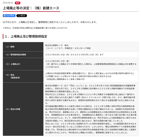 創建エース逝ったか — スペさん (@kumakuma7) August 18, 2025 https://www.jpx.co.jp/ 「上場会社が有価証券報告書等に虚偽記載を行い、直ちに上場を廃止しなければ市場の秩序を維持することが困難であることが明らかであると当取引所が認める場合に該当」 最初の会社名なんだったっけ…社名ロンダリング会社の末路か、これがwww — わいけー (@counter_stock13) August 18, 2025 髙杉建設⇒キーイングホーム⇒千年の杜⇒東邦グローバルアソシエイツ⇒クレアホールディングス⇒中小企業ホールディングス⇒創建エース⇒上場廃止 — ありゃりゃ (@aryarya) August 18, 2025 創建エースをどの名前で知ったかで年齢がわかる — アノイト (@anointyouonfire) August 18, 2025 クレアからしか知らないんだけど、クレアの時点であとの方かよwwwwwwwwwwww — わいけー (@counter_stock13) August 18, 2025 高杉〜から始まりソチ人口島まで話題が絶えなかったな — ぷっちょ (@puchogen) August 18, 2025 実生活でも、インドネシアのエビ養殖、アフリカの石油採掘、草コインとか、クソ投資ネタは一杯聞いたけど、人工島の面白さには敵わない。シリーズ成田では越えれない壁がある。さすが上場企業だ(´・ω・`) — (しωん)-METAL (@shin3kibou) August 18, 2025 ロシア領土の人工島でダチョウ飼育するとか天然ガス掘るとかして逆転目指して欲しかった — 居残り佐平次🍥 (@inokori_3814) August 18, 2025 創建エースの株価53(ゴミ)で笑う pic.twitter.com/ZgfbQFKFlh — こたろー/仮想通貨/株 (@metapurapura) August 18, 2025 ※夜間取引市場で暴落 東証カジノってのはゴミを宝にするゲームなんだよ — †二次絵愛好不動産投資家† (@DORAE1313) August 6, 2025 ちゃんとフラグはあったんだな — あさぎトレード (@asagitrade_) August 18, 2025 最近東証のクソ株上場廃止決定早くなってない?東証改革の一環で浄化作戦でもやってるんかな — 岐阜っ子サリー (@kozukozu331) August 18, 2025 後継のクソ株が充実してるのが困る(´・ω・`) — (しωん)-METAL (@shin3kibou) August 18, 2025 https://kabutan.jp/stock/chart?code=1757 Source: 市況かぶ全力2階建 投稿ナビゲーション クマが中学校に進入 副校長がクマの前に立ちはだかりにらみ合い、生徒守る 岩手県 大阪出張してる明日新世界いってみる