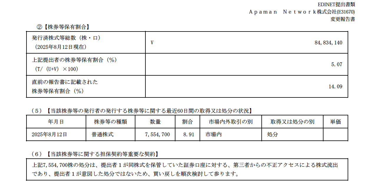 システムソフトってなんか悪いことしたの? — 日村 (@imakebaiikabu) August 12, 2025 情報は出てこない400万株超の特売りになってたけど低位で発行株数の5%ぐらいだから大株主売りとも言い切れず個人の集合売りの可能性も — 日村 (@imakebaiikabu) August 12, 2025 システムソフト底取った人すごいな pic.twitter.com/Gbf3Q1iNjX — マニー (@BDqxslKVXU2CBdG) August 12, 2025 https://kabutan.jp/stock/chart?code=7527 システムソフト不正取引の可能性もあるのかな? — にゃんたまω (@nyantama2323) August 12, 2025 筆頭株主法人乗っ取りとかもあるんかね。やばいだろ。 — バク (@bakubaku776) August 12, 2025 https://www.systemsoft.co.jp/ え、法人で持ってる口座が乗っ取られてそうってこと…? — まいる (@flagcrashers) August 12, 2025 本当に不正アクセスで売られてたのわろたw — たかぴー (@takahirokabuu) August 19, 2025 アパマン、システムソフトを不正アクセスで売られるとかマジであるんだ…。買い戻すとは書いてるけど、順次検討かぁ(´・ω・`)https://t.co/lihiC8DFYG pic.twitter.com/mMiTMulEYm — ざら速(ザラ場速報) @ときどき仮想通貨 (@ZARASOKU) August 19, 2025 ※筆頭株主のApaman Networkの保有株、1185万株→(不正アクセスで勝手に755万株売却)→430万株」「7,554,700株の処分は、提出者1(=Apaman Network)が同株式を保管していた証券口座に対する、第三者からの不正アクセスによる株式流出であり、提出者1が意図した処分ではないため、買い戻しを順次検討して参ります」 企業保有の株式を不正アクセスで手放させられたっていやはや — てつ💉💉💉💉💉💉 (@jintetsu1980) August 19, 2025 アパマンのやつ東証でもヘアシュしちゃったの — うしっクマ (@bullbear48) August 19, 2025 ※アパマンショップ、120ヘヤシュで店ごと消失させて特別損失10億円(2019/02/13) 令和のジェイコム — PON (@pon_tosyou) August 19, 2025 当たり前っちゃ当たり前なんだけど、企業が保有する株式もネットから売却できるんだね。 — 成田 (@E231_0) August 19, 2025 法人口座にアクセス出来るだけでヤバいしオーダーが簡単に通るのはもっとヤベーカストディ何処か知らんがザルすぎいいィィィィ — ぷっちょ (@puchogen) August 19, 2025 まさかとは思うがアパマンそこいらのネット系証券に預けてねぇよな⁉︎ケース次第やが補償原則5割やから特損出すぞ — ぷっちょ (@puchogen) August 19, 2025 買い戻すにもまあまあな量ですけど — たかぴー (@takahirokabuu) August 19, 2025 システムソフトこっから市場で買い戻しあるんかなぁ750万株はくそでかすぎる量にも思えるけど — アノイト (@anointyouonfire) August 19, 2025 インフラを市長に任せるきぬた歯科ときぬた歯科に歯が立たないアパマンショップ pic.twitter.com/U2xQamex4t — けいみん (@Keimin_Keio) May 12, 2024 https://kabutan.jp/stock/chart?code=7527 Source: 市況かぶ全力2階建 投稿ナビゲーション 【悲報】レンタルしたモバイルバッテリーを売ってしまう人がいる模様 メインPCあるのにミニPC買っちゃったんだがこれ何使うの?