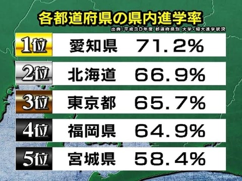 1: 2025/08/21(木) 16:49:59.40 大学入学者の地元残留率 1位 愛知県(71.3%) 2位 東京都(67.6%) … 46位 鳥取(15.2%) 47位 奈良(14.3%) 文部科学省『学校基本調査』 愛知県の高校生の進学先の県 1位 愛知県 72% 2位 東京都 5% 続きを読む Source: 投資ちゃんねる – 株・FX・仮想通貨・投資2chまとめ 投稿ナビゲーション 与党が一律2万円の給付金案を見直しか 【朗報】ワイ、サマージャンボ当選する!!!