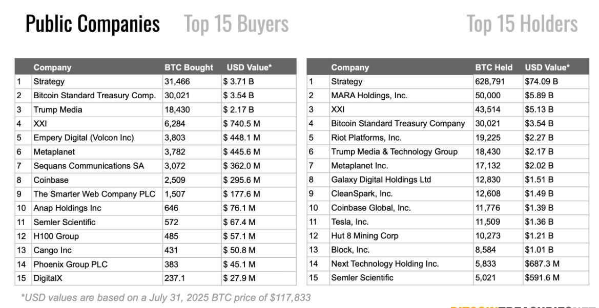 Bitcoin Treasuriesの研究者によれば、企業による大幅な純増は、7月に追跡されたすべてのカテゴリで追加された166,000 BTCのほぼ3分の2を占めていました。主要な購入者が活動を支配しました。ストラテジー(MSTR)は31,466 BTCを追加し、全体で628,791 BTC(740億ドル)となりました。