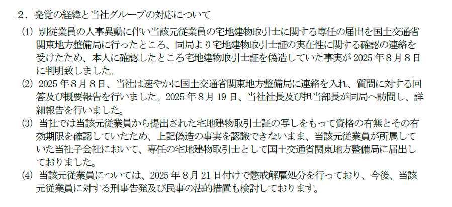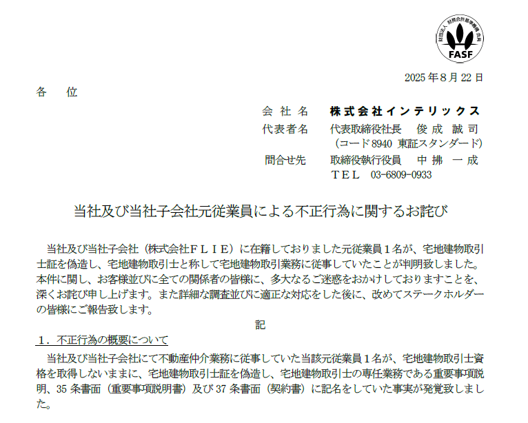 昨日知り合った三◯不動産出身の人から、「タクシー会社に運転免許持たずに転職する?しないだろ?」という、免許取るまで2年間詰められた話しを聞いた。 — マ• 髙# (@takaimayu) October 31, 2024 自己採点だと受かってたんですけどじゃねんだよ! てめぇ最初から嘘ついてたんじゃねえのか?宅建を舐めてんじゃねぇよ! 学生も主婦も資格マニア達も参戦してくる大人気国家資格だろうが。 俺たちは戦争やってんだよ!! pic.twitter.com/majPVLMMcX — コウさん (@sayonarabank) August 25, 2024 地面師たち 宅建偽造からの宅建くらい簡単に取れるだろの流れになってるのでインテリックスは宅建受験生にも謝罪すべき。 — たくや社長 | 地場不動産 (@fudousanlove) August 22, 2025 インテリックス、従業員が、宅地建物取引士証を偽造し、宅地建物取引士と称して宅地建物取引業務に従事していたことが判明 pic.twitter.com/54H0Ee6gU7 — ありゃりゃ (@aryarya) August 22, 2025 https://www.intellex.co.jp/「元従業員1名が、宅地建物取引士資格を取得しないままに、宅地建物取引士証を偽造し、宅地建物取引士の専任業務である重要事項説明、35条書面(重要事項説明書)及び37条書面(契約書)に記名をしていた事実が発覚」 インテリックス偽造宅建事件の概要読んだけど、偽造宅建士を専任に登録しようとして発覚したのウケるなw 上司「君を専任に登録しといたから」偽造宅建士くん「」 みたいなww — たくや社長 | 地場不動産 (@fudousanlove) August 22, 2025 偽造で懲戒解雇、刑事告発及び民事の法的措置も検討中とか詰みでんな — 居残り佐平次🍥 (@inokori_3814) August 22, 2025 宅建のやつ、新卒が試験落ちたの隠してたのか、偽造身分証として使用されてたのを使って中途転職してきたのか、よくわからんな — や@ちゃんと手を洗ってマスクと換気と予防接種と記帳 (@ya198311) August 22, 2025 しっかし人事異動で資格免許出せいうて初めてバレるとかどんだけザルやねん業界で宅建臨時点検するやろうから他もでてきそうやね pic.twitter.com/5AvwjEkv8d — ぷっちょ (@puchogen) August 22, 2025 仮に宅建資格落ちまくって実務できますで無資格で突っ張ったならまだしも偽造やからな営業停止処分ぐらいはしといた方がええやろね — ぷっちょ (@puchogen) August 22, 2025 インテリックスの件を踏まえて、宅建士証の作りを今のちゃっちいやつから変えようよ。素人でも余裕で偽造可能やろ。 — ぎんりゅうたん@関西 (@goodre_hoihoi) August 23, 2025 弁護士のセンセ3人に囲まれて、きらめく知性で窒息しそうになりました。わしも宅建士もってなかったらやばかった。 — 全宅ツイのグル (@emoyino) June 17, 2024 契約時に宅建士証を忘れ、運転免許を提示して乗り切った時に、本当はエクスタシーを感じていたんじゃないですか…? pic.twitter.com/cvFDIfyVVC — かずお君 (@kazuo57) August 1, 2024 地面師たち https://kabutan.jp/stock/chart?code=8940 Source: 市況かぶ全力2階建 投稿ナビゲーション 🤖😨「2030年までに消える」5つの職種、AIの脅威にどう備えるか? 【速報】日本政府、過疎地域にアフリカ移民を受け入れる模様wwww