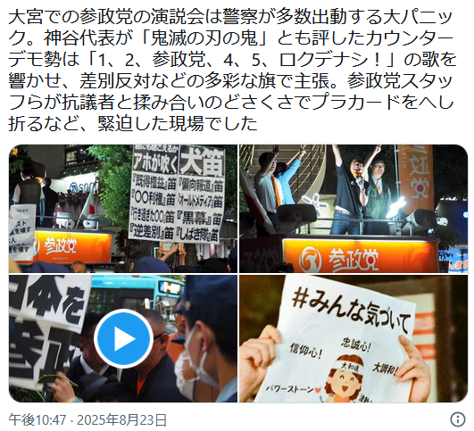 1: 名無しさん@おーぷん 25/08/24(日) 09:20:05 ID:HqC5 巨大プラカードと大声で演説を妨害するカウンターデモ隊 vs 実力行使でプラカードを破壊する参政党スタッフ の間で小競り合いが起き、警察が多数出動する事態になったもよう 続きを読む Source: 哲学ニュースnwk 投稿ナビゲーション あなた子よ!見てエコー写真!メルカリ「胎児のエコー写真出品禁止します」 田村淳、クルド人問題に「擁護するつもりなど全くありません」再度釈明 酷い誹謗中傷には「然るべき対応」