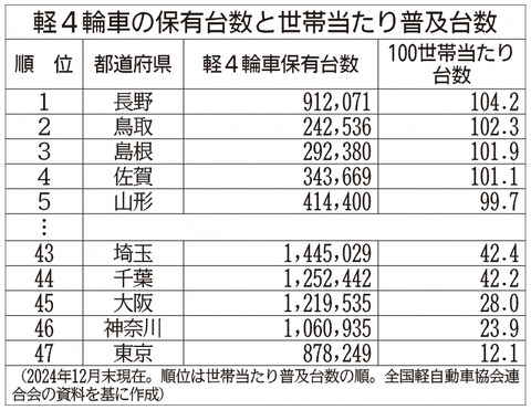 1: 2025/08/26(火) 11:41:34.44 ● BE:837857943-PLT(17930) sssp://img.5ch.net/ico/u_utyuu.gif 全国軽自動車協会連合会(全軽自協)の集計によると、2024年12月末時点の軽4輪車の世帯当たり普及台数は100世帯につき54・46台だった。前年比0・03台減少し3年ぶりにマイナスとなった。 軽4輪車の保有台数は同10万3821台増(約0・32%増)の3210万8227台だった。軽4輪車の保有台数は継続して増加しているものの、 世帯数(外国人世帯数を除く)の増加率(約0・37%増)が軽4輪車の保有増加率を上回ったことから微減となった。 24年12月末の都道府県別の普及率は、長野県が100世帯当たり104・2台で最も高かった。最も低かったのは東京都で同12・1台だった。 「100世帯に100台(1世帯に1台)以上の普及」は4県で、前年と同数だった。 同集計は総務省の「住民基本台帳に基づく世帯数」と、国土交通省の「自動車保有車両数」を基に算出した。 https://newswitch.jp/p/46761 続きを読む Source: 投資ちゃんねる – 株・FX・仮想通貨・投資2chまとめ 投稿ナビゲーション 日本酒の風味とか香りを楽しめる人間になりたかった 外務省&JICA「アフリカが移民してくるのは誤情報なんだぁあぁああ!!!」