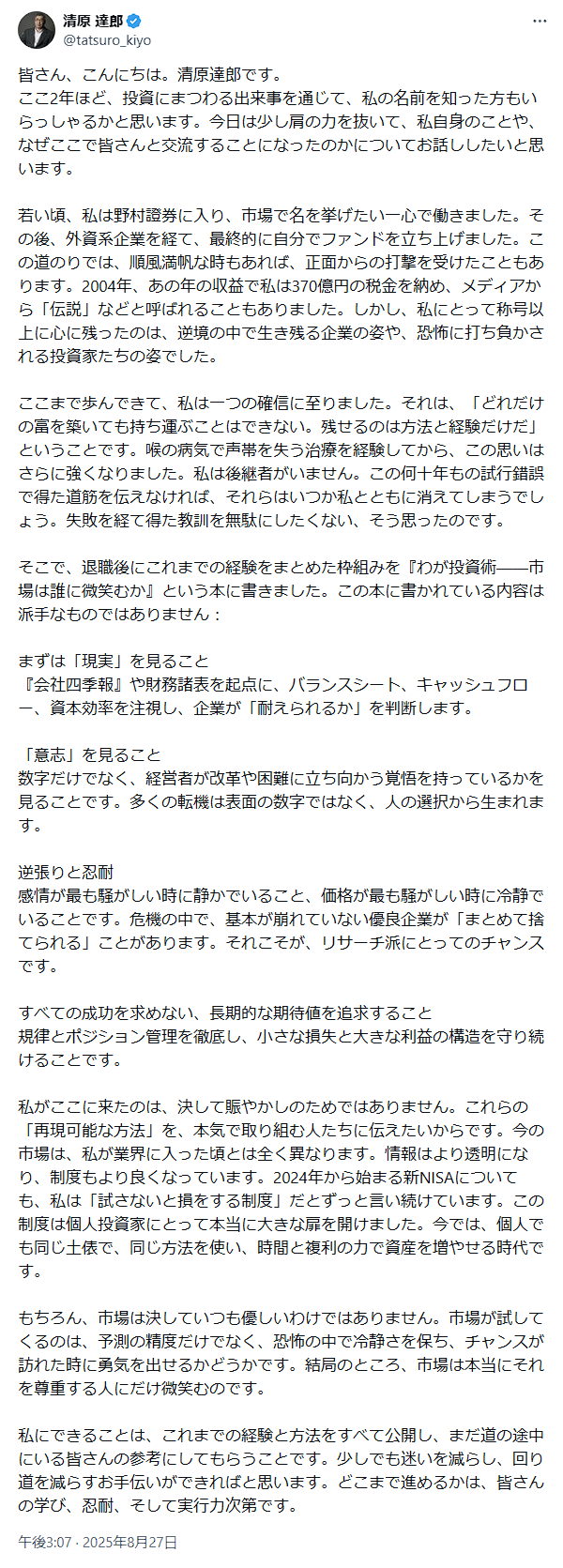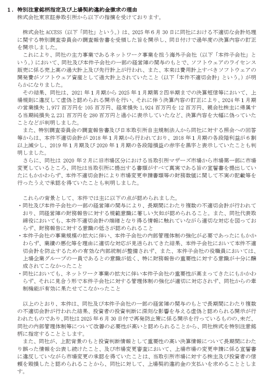 損して辛いからACCESSのチャートを見て心を宥めるか pic.twitter.com/nOZ8atnIYL — アルファ(暫定) (@aru_pha) August 27, 2025 https://kabutan.jp/stock/chart?code=4813 2025/08/27 12:00 ACCESS 特別注意銘柄の指定及び上場契約違約金の徴求に関するお知らせ https://www.access-company.com/ Access決算粉飾するわ市場変更時に虚偽記載するわやり過ぎやな清原の親父とうとうやらかしたな上場廃止や pic.twitter.com/SwF3LBTBgU — ぷっちょ (@puchogen) August 27, 2025 「海外子会社において、同社及び本件子会社の一部の経営陣の関与のもとで、ソフトウェアのライセンス販売に係る売上高の過大計上及び先行計上が行われ、また、本来は費用計上すべきソフトウェアの開発費がソフトウェア資産として過大計上されていた」 「2021年1月期から2025年1月期第2四半期までの決算短信等において、上場規則に違反して虚偽と認められる開示を行い、(中略)決算内容を大幅に偽っていたことなどが判明」 「2019年1月期及び2020年1月期の各段階損益の赤字を黒字と表示していたことも判明」 「2020年2月に旧市場区分における当取引所マザーズ市場から市場第一部に市場変更しているところ、(中略)本件不適切会計により市場変更申請書類等の財務数値に関して不実の記載等を行ったうえで承認を得ていたことも判明」 「2025年8月27日から原則1年間とし、1年後に当社から内部管理体制確認書を提出、株式会社東京証券取引所が内部管理体制等の審査を行い、(中略)内部管理体制等が適切に整備され、運用されていると認められない場合には上場廃止となります」 清原さんの本さえ読んでないけどACCESSに100億規模の筆頭株主ですか。諸行無常はこの世の常か。 — 株っち (@kabucchi25) August 27, 2025 https://www.access-company.com/ ACCESSの件、書籍発売以後ずっと監視しているんですけどまあまあ大変ですね。特別調査費用だけで26億円とか企業規模に対して大きすぎるし、これからたぶん各種訴訟の対応もあるし、BPSが232.16円になってるということは理論的には株価100円台もあり得るってことだし、考えただけで気分が悪くなる、、 — ん (@K59043813) August 27, 2025 ACCESSついに潰れるのかなと思ったけどまだお金そこそこ残ってるんだね ライブドアショック前に500億とかとんでもない巨額資金調達成功してその金で生き延びているゾンビ系 — さふぁいあ (@sapphirekun) August 27, 2025 清原達郎ニキ見てると株ってホンマに中毒性が高いんやなって思うわ。 — ボヴ (@cornwallcapital) June 11, 2024 ※タワー爆弾で悪名を馳せた清原達郎さん、不良が捨て猫を拾う理論で褒められる(2024/08/18) 一瞬、「清原御大も大損抱えるとお気持ち長文ポエムを詠み出す」心温まるエピソードが来たかと期待してしまった — 焼き魚 (@roast_fish_koge) August 27, 2025 これ明らかに偽物だよな。利用開始が2011年2月というのが変だし、資産800億円の本人がAmazonのアフィリエイトリンク貼るわけない。 pic.twitter.com/7C5MVt0PN1 — CatPower55 (@CatPower55) August 27, 2025 本物の清原達郎さんかと思いきや、ついにLINEに誘導しだした。 pic.twitter.com/JTYWTnqP1y — Reo (@shitaketanegi) August 26, 2025 以前はサッカー好きな外国のアカウントだったのに転生されたのですか pic.twitter.com/IglvDzBOq2 — やまやま (@yamayama5522) August 19, 2025 お金が手に入ったから、次は自尊心を満たしたいとか、世の中に貢献したいとかでセミナー受けたり本出したりすんのは分かるけど、自分の名前汚しても高額商材売ったろにはならんよな — 山田 (@u2yamada) June 5, 2025 Source: 市況かぶ全力2階建 投稿ナビゲーション 【朗報】トランプ大統領、『国防総省』を『戦争省』に変更発表 来週から 就職しないと施設に入れると親に宣言されたから親の口座漁る