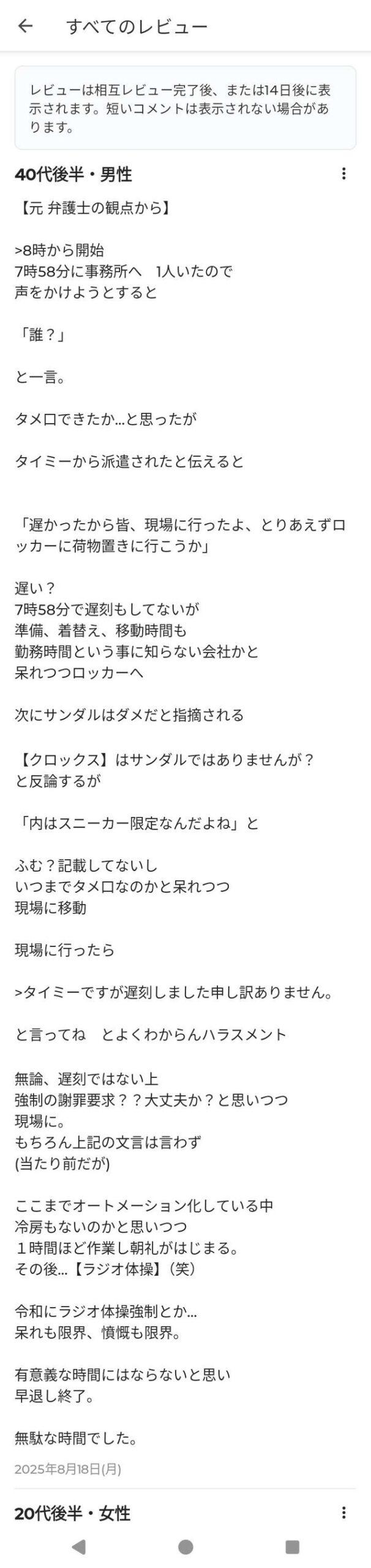 1: クロスヒールホールド(地図に無い島) [US] 2025/09/02(火) 17:02:40.42 ID:rd39A+mz0 BE:828293379-PLT(12345) ・仕事の準備も勤務時間に含まれることを知らない社員たち ・勤務時間に準備を始めたら遅刻扱いにされて謝罪を強制される ・ずっとタメ口 ・朝礼後に謎のラジオ体操をやらされ、とうとうブチ切れて帰る 続きを読む Source: 哲学ニュースnwk 投稿ナビゲーション 【大阪】パン工場から失踪のベトナム人らをゴミ収集で雇用か 不法就労助長の疑いで男3人逮捕 【特殊詐欺】「断ったら逮捕状を執行する」警察官かたる電話で1100万円だまし取られる 30代公務員女性が被害 静岡
