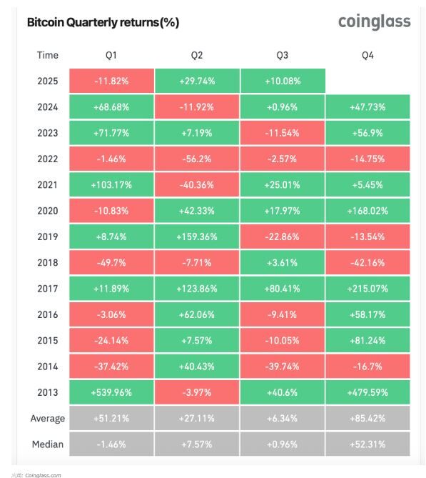 通常、特に強気相場では、第4四半期が注目されます。データによれば、ビットコインは過去12年で8回、第4四半期をプラスで終えており、2017年(+215%)、2020年(+168%)、2013年(+479%)のような際立った年がありました。より控えめな年でさえ、第4四半期のリターンは多くの場合、前の四半期を上回っています。平均して、第4四半期は85%のリターンを示しており、中央値は52.31%です。