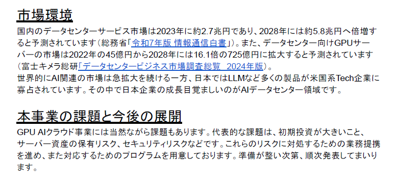 「GPU AIクラウド事業には当然ながら課題もあります」