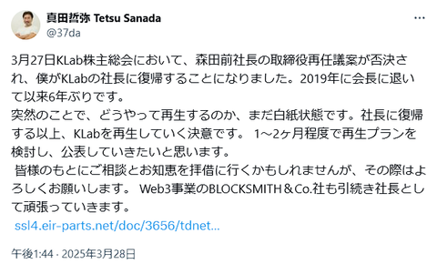 会社が白紙にならないとよいけれど — believe × (@airbe) March 28, 2025 真田なんて株売ってたしやる気ないやろもう。悪の組織空売り機関許さんって言ってた時が全盛期やろ — anne (@stupiddialog) March 27, 2025 ※社長が「空売りしている皆様は首を洗ってお待ち下さい」発言のKLab、けっきょく空売り大勝利の様相に(2018/08/07) 真っ赤に茹で上がったカニ(KLab) — believe × (@airbe) January 8, 2025 https://kabutan.jp/stock/finance?code=3656 KLabさんはもう7年くらい早く、ゲームじゃない技術力側の事業をリコンストラクトしていれば、良い人材を逃さないでもっとうまくやれたんじゃないかなぁ… — てん (@tsuchi99) September 10, 2025 KLab、総会後の体制でみなヒラ取締役になっているのをみるに、もはや誰も役員を務めたくないのだろうなあと真田さん社長復帰で株価は幾分か戻ると思うけど効果は限定的、株主構成的にも「支え」がなく、プライム市場を維持できず自然的な上場廃止を狙っていくのでは — 三河屋 (@mygmkt) March 27, 2025 KLab、GPU AIクラウド事業に参入 pic.twitter.com/nZZQ2zoY14 — ありゃりゃ (@aryarya) September 10, 2025 https://www.klab.com/ AIサーバーはじめました — ありゃりゃ (@aryarya) September 10, 2025 なんか原初のソシャゲ乗り出す前の会社に戻ろうとしてる? — みこみこえぃす (@3535ace) September 10, 2025 なんか蟹、課題に挙げてる初期投資のためにワラントか何かやりそう? — K2 #ぽ信 #観測者 ✂️🍊🐈 (@beyondthemoon10) September 10, 2025 「GPU AIクラウド事業には当然ながら課題もあります」「代表的な課題は、初期投資が大きいこと」「リスクに対処するための業務提携を進め、また対応するためのプログラムを用意」 赤字体質で手持ち金が心許ない企業が大げさなプレスリリースを出したときは、増資/ワラントなどで資金調達をする前に、一時的に株価を上げておきたい等の思惑も混在しているので 今日の夕食は蟹にしよ — 猫もどき@投資系VTuber🛸 (@UnluckyTrigger) September 10, 2025 また中身の無い糞会社がAIサーバー。しかもチャート見るとこれ(´・ω・`) pic.twitter.com/h4LBs4MRyG — ざら速(ザラ場速報) @ときどき仮想通貨 (@ZARASOKU) September 10, 2025 https://kabutan.jp/stock/chart?code=3656 これはサイダーしゅわしゅわしとるわ… — みこみこえぃす (@3535ace) September 10, 2025 過去にMSワラントを出したことがある会社を投資対象から消すだけで投資家として生き残れる確率が30%上がります — 山田 (@u2yamada) August 15, 2025 Source: 市況かぶ全力2階建 投稿ナビゲーション アメリカの最大手保守系論客、屋外公演中に撃たれる 【みんなの意見】キャッシュ決済←結局どれが最強なん?
