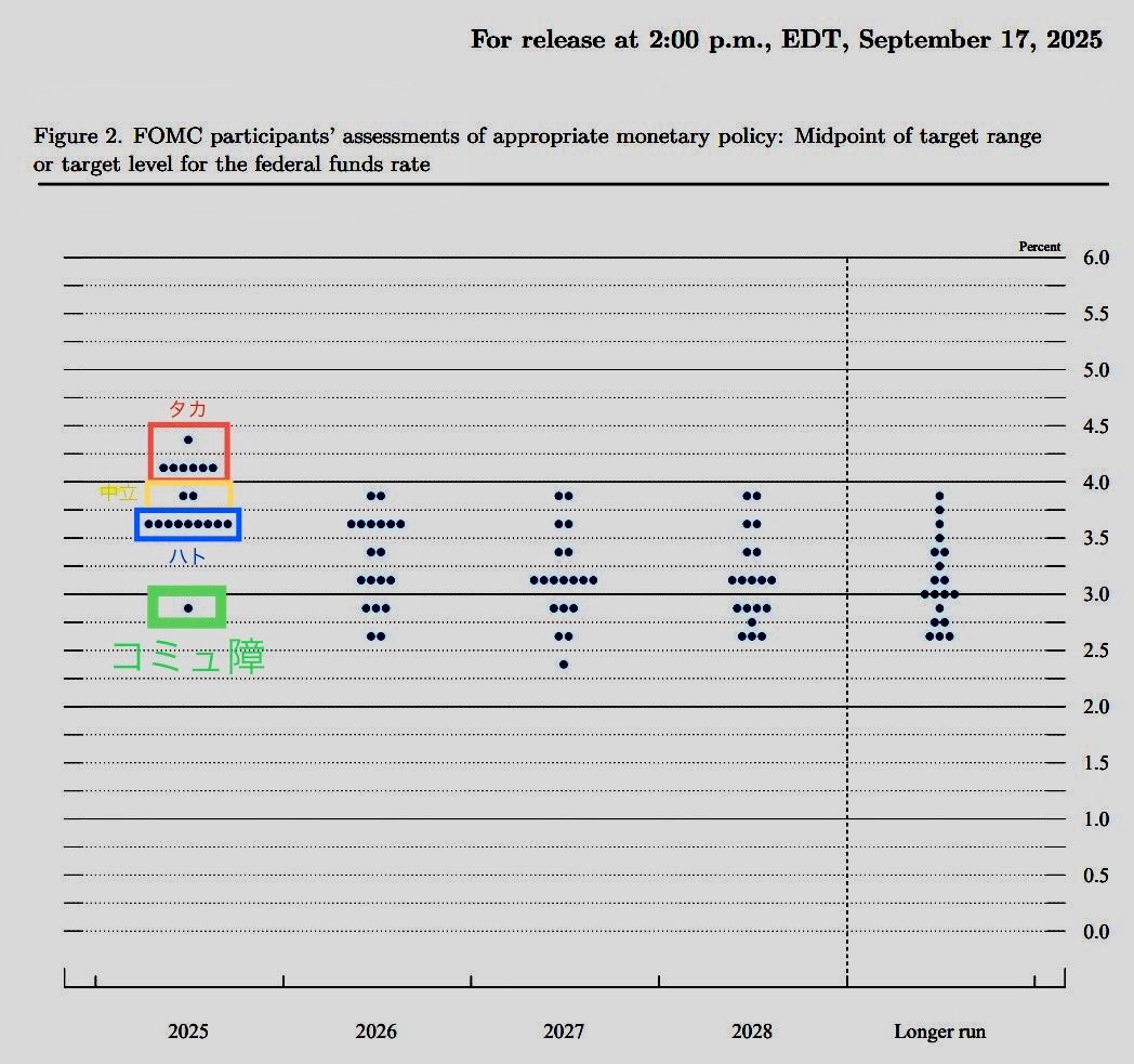 FOMCは思ったより年内追加利下げなし派が多いなと感じた以外は想定通り。今後は10月利下げ有無が焦点だけど、関税インフレが一時的という点については流石のパウちゃんも自信を深めてたので、雇用関連指標だけが論点。9/30