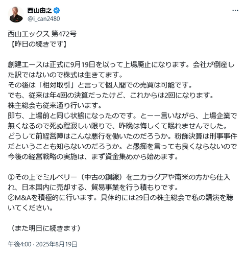 創建エース?っていう銘柄よく知らないんですけど、今後市場のエースとしてクリミアに人工島建てて太陽光発電でESGしつつ、ダチョウ牧場作ってで卵から抗体作り出して全世界を救うぐらいしてくれる銘柄だと信じてました 残念です — 西達ヤン (@r_nsr24d) August 18, 2025 クソ株の典型として、海外の大型事業、は覚えておいた方が良い。今偉そうにしてるコサカスもみんなウェッ○でやられてたw — さらだぼうる (@saladbowl7) September 10, 2025 西山さん、ぶっこきそうだから必死やなww — 居残り佐平次🍥 (@inokori_3814) August 19, 2025 ※29年間で社名ロンダリング6回の創建エース、ここに来て優しい東証の怒りが収まらず切り捨てるように上場廃止へ(2025/08/18) 創建エース(旧中小企業HD(旧クレアHD(旧東邦グローバルアソシエイツ(旧千年の杜(旧キーイングホーム(旧高杉建設)))))))なんて元々悪いことたくさんしてたでしょ新社長が代理で個人弁済したりしてる訳でさ文句言いやすい人間が社長になってから課徴金課して上場廃止とか金融庁の怠慢じゃないの? — 岐阜っ子サリー (@kozukozu331) September 17, 2025 ※株式会社創建エースにおける有価証券報告書等の虚偽記載に係る課徴金納付命令勧告について(2025/09/17)「金融商品取引法に基づき算定される課徴金の額は、7844万円」 東証カジノで投資家保護という発想そのものが軟弱 — 悪来 (@AKURAI_NK) September 10, 2025 上場廃止になっても株券は無くならない再上場で100倍になってもおかしくないってアホ板に書いてくるか — 元BLTさん (@DarknessBLT) August 22, 2025 創建エースは1円張り付きでお別れ pic.twitter.com/sU8EdoaWHH — アルファるふぁ (@aru_pha) September 18, 2025 1円磔刑はここ最近お目にかかれんぞw — ぷっちょ (@puchogen) September 18, 2025 1円退場上場廃止株恒例(倒産株は除く)の1万円チャレンジしてみた pic.twitter.com/ZQ5D9A20XZ — 居残り佐平次🍥 (@inokori_3814) September 18, 2025 (小さく実質)1円、っていう店頭POPみなくなったな。ガラケーの時代は携帯ショップ行ったらみんな1円だった。でも実際はもっとぼったくられた。 — もかちゃんさん (@moka_chan_) September 17, 2025 クソ株の彩がまた一つ消えたなぁ pic.twitter.com/jSxXpRQsNY — ぷっちょ (@puchogen) September 18, 2025 人工島作ってダチョウ育ててナノバブルのように消えて欲しかった。 — ろうちく🔰労畜 (@rebreb01541) August 18, 2025 https://kabutan.jp/stock/chart?code=1757 Source: 市況かぶ全力2階建 投稿ナビゲーション 地球温暖化ってあると思う? 地方民「都会より地方の方が住みよい」←これマジ?