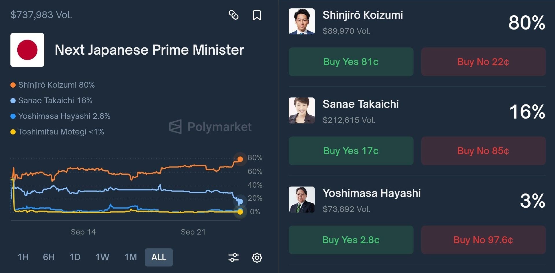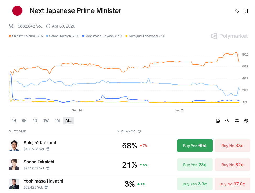 海外賭けサイトのポリマーケットでは小泉進次郎氏がほぼ勝ち確に pic.twitter.com/mwUvLv2ZsG
