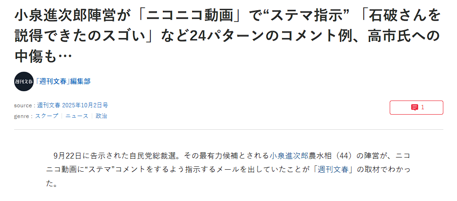【文春砲】小泉進次郎さん、出演のニコニコ動画放送で”自演コメ”を指示か