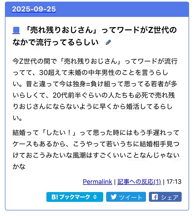 1: それでも動く名無し 2025/09/26(金) 07:18:40.68 ID:srT5et/50 今Z世代の間で「売れ残りおじさん」ってワードが流行ってて、30超えて未婚の中年男性のことを言うらしい。昔と違って今は独身=負け組って思ってる若者が多いらしくて、20代前半ぐらいの人たちも必死で売れ残りおじさんにならないように早くから婚活してるらしい。 結婚って「したい!」って思った時にはもう手遅れってケースもあるから、こうやって若いうちに結婚相手見つけておこうみたいな風潮はすごくいいことなんじゃないかな 続きを読む Source: 哲学ニュースnwk 投稿ナビゲーション パナソニック、1万人クビ。40歳から59歳の社員が対象。AIで不要になったため パラグライダーでアクシデント、高度1100mから落したGoProが恐怖の瞬間を記録