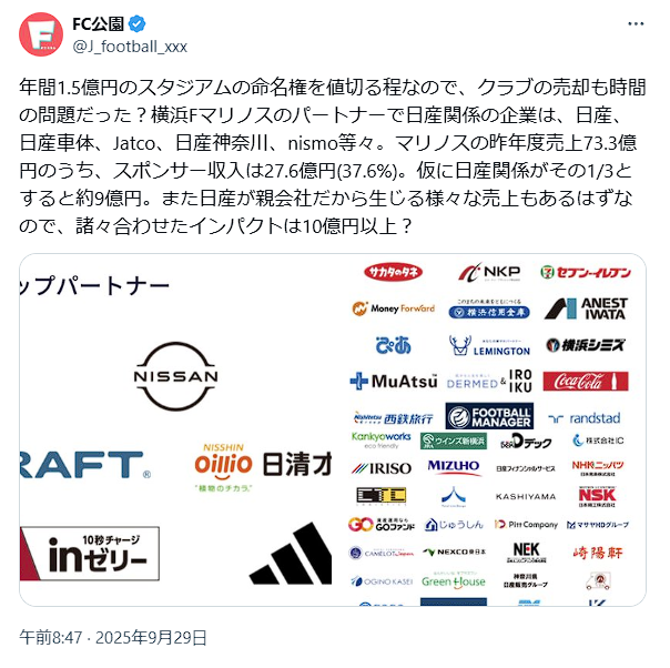 買い手目線でマリノスを見たとき既に「伝統がある」「ブランドが確立している」「事業規模が大きい」ことがプラスにならない可能性があって、逆に「J2、J3を買って投資して成長させる」プランのほうが好まれやすい傾向はある。町田も大宮も相模原もそうですよね。