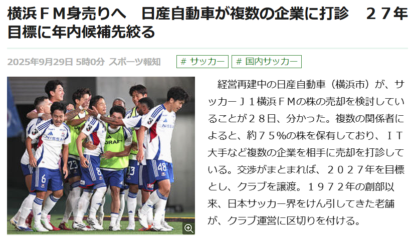 日産がマリノスの株を売却することは「まあ、そうなるよね」という話。ただ「これから買い手を絞る」みたいな出方はあまりよくないし、記事の解像度も低いように思った。それに「IT大手」は一通りプロスポーツに手を出していて、どこか残っていましたっけ?