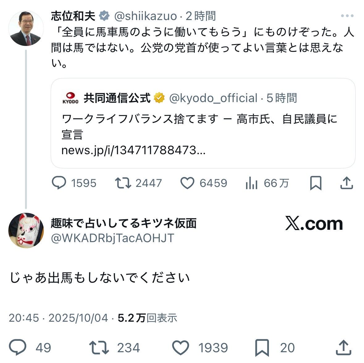 志位氏「人間は馬ではない。公党の党首が使ってよい言葉とは思えない」 →では出馬もしないで下さい 2025年10月5日 気になニュー 1: Mr.メントス(埼玉県) [US] 2025/10/05(日) 07:50:57.25 ID:sok0ZVzu0● BE:662593167-2BP(2000) 続きを読む Source: 哲学ニュースnwk 「【朗報】おそ松さんの新実写版、あまりにも六つ子が似すぎている件」 「京都で謎の重低音。寝れないと相次ぐ」 コメントをどうぞ 返信をキャンセルする。 名前 (必須) メールアドレス(公開されません) (必須) ウェブサイト コメント送信 Δ