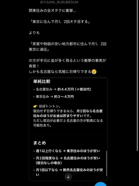 1: 2025/09/30(火) 11:13:12.68 BE:732289945-2BP(2000) 東京の家賃は高すぎるため https://twitter.com/YUUNA_BURUBESUM/status/1972826223765299506 東京脱出ゆりな @YUUNA_BURUBESUM 関東住みの全オタクに衝撃… 「東京に住んで月1、2回オタ活する」 よりも 「家賃や物価の安い地方都市に住んで月1、2回東京に遠征」 の方が手元に金が多く残るという衝撃の事実が発覚! しかも名古屋なら気軽に東京大阪に日帰りできる😢 続きを読む Source: 投資ちゃんねる – 株・FX・仮想通貨・投資2chまとめ 投稿ナビゲーション 大手企業に転職したけど待遇恵まれすぎワロタ 【自民党新総裁】高市氏 総裁選で戦った4人を党要職や閣僚などに起用する考え