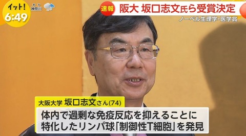 ノーベル医学生理学賞坂口志文氏らの受賞決定 過剰な免疫反応を抑える事に特化したリンパ球「制御性T細胞」を発見 めでたい pic.twitter.com/B3G8QsS0XR — ゆるふわ怪電波☆埼玉 (@yuruhuwa_kdenpa) October 6, 2025 日本人で「しもん」って名前はなんか素敵だね — さるたろ (@super_sarutaro) October 6, 2025 ついに阪大からノーベル賞が出ましたね。素晴らしい。 — あ〜る菊池誠(反緊縮)公式 (@kikumaco) October 6, 2025 阪大の教授やった父がよう「そもそも湯川秀樹は元阪大や!」と言うてたけどホンマに阪大からノーベル賞が出ましたな — サライネス …自称漫画家。 (@SAARA_INES) October 6, 2025 1本の論文の引用数が1万越えってもう次元が違うな — るん (Run)→Infurnity (@run_charizard) October 6, 2025 応用研究も大切だけど基礎研究が軽視されてきてるのでもっと色々と支援してあげて欲しい — 腐屍✨ゾンビらしい (@monoriasu) October 6, 2025 制御性T細胞(Treg)って、「はたらく細胞」だとこの人(CV:早見沙織)アニメも勉強になるなぁw pic.twitter.com/10EeRmEAFW — suizouさんと他2024人の愉快な仲間 (@suizou) October 6, 2025 はたらく細胞 制御性T細胞がなにをしているのかはぜんぜん知らんが、CV.早見沙織って時点でそれがなにか重要な働きをしているのはわかる(・∀・) — 渡辺真澄 なべ亭@権堂 (@nabetei) October 6, 2025 制御性T細胞はありまぁす! — なめるなよ (@PlayerNatural9) October 6, 2025 ゼロでした T細胞だけならそこそこあるがどれがどれだかw pic.twitter.com/PyN2K56Ihk — へろんぽらん@最底辺投資の人 (@heroherogreen) October 6, 2025 医学生物学研究所もテラももういないな() pic.twitter.com/WMu9b3d6WU — なめるなよ (@PlayerNatural9) October 6, 2025 ブライトパス関係ないやろ、業績に1ミリも関係ないやろw — ワンワン7777💪 (@7777WanWan7777) October 6, 2025 https://www.sbisec.co.jp/ メディネットもめっちゃ上げてる — 急騰🐣 (@kgbukabu) October 6, 2025 https://www.sbisec.co.jp/ 中外製薬はこんなこともしているのね。https://t.co/kSLAzINqG7 — ただひと (@VTI15436341) October 6, 2025 中外製薬あっという間に上がってた — パパス (@papasu011) October 6, 2025 https://www.sbisec.co.jp/ 同じ大阪大学でもアンジェスとはえらい違いやん。 — べるつ (@Seatbelz) October 6, 2025 ※株券印刷業大手のアンジェス、創業者の森下竜一さんが「大阪ワクチン・大阪万博・機能性表示食品と金のなる木すべてに群がっている」と国会で槍玉に(2024/04/25) 昨今の舐め腐った増資ムーブ見てア○ジェスの森○とかトチ狂ってデータセンターとか仮想通貨やりますとか本気で言い出しそうで怖い — 2代目琵琶丸 (@2eTzXR96gXdOdGV) September 17, 2025 Source: 市況かぶ全力2階建 投稿ナビゲーション 有識者「低収入で頭の悪い人ほどラーメンをよく食べるんです」←これ確かに一理あるよな 【速報】日本人がノーベル賞受賞!!!!!!