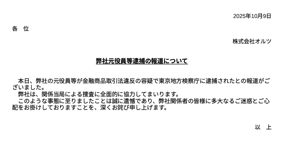 2025/10/09 オルツ弊社元役員等逮捕の報道について