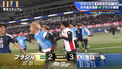 アサヒがランサムウェアでダウンしてる間にキリンが最高の宣伝してる(ブラジルに勝った) — なかしん (@nowcowsing) October 14, 2025 すごい、ブラジル相手に逆転勝利 pic.twitter.com/Q57A5lx9pD — UG & The Revolution (@soccerugfilez) October 14, 2025 日本半端ないって。あいつら半端ないって。2分11敗していたサッカー王国相手に劇的な大逆転で初勝利するもん。そんなんできひんやん、普通。 — 大迫はんぱないbot (@osako_hanpa) October 14, 2025 これはすごい金星 — 哲戸(´・_・`)次郎丸 (@pp_GIRAUD) October 14, 2025 やったやった。間違いが起こったぞ。逆転は実力で。 — つくよみ🕸️ (@rosicky07stpone) October 14, 2025 逆転できるのは実力ある証拠やな — ちぇるもり(世界王者) (@chelmori92) October 14, 2025 21世紀になってブラジル代表は初めてアジア相手の黒星 — 麻婆亭 まぁ坊 (@maaboo_glz) October 14, 2025 ブラジル代表がハーフタイム中に2点リードしていて逆転負けしたのは親善試合をひっくるめて史上初なんだと。 — スケゴー (@sukego_fut) October 14, 2025 韓国相手に0-5で圧倒して日本に乗り込んできたブラジル相手にどうなるかと心配してたけど、まさか勝つとは — ぱおぱお (@paopao0128) October 14, 2025 後半は守備のシステム変更と同時に日本に流れが来てそこから3点取って逆転とかもうマジで脳汁出る展開だった 日本が守備システムを変更してきたのでブラジルはサイドの個人突破に攻撃を絞った システム的にそこが弱くなるのだが、望月以外は一対一でブラジルのアタッカーに勝った それが勝因 — pal9999 (@pal9999) October 14, 2025 開き直ってプレッシングをかけ始めると滅茶苦茶に強く、そのゲームになってしまえば格上であろうと倒してしまう謎のチーム、日本代表。 — 結城 康平 (@yuukikouhei) October 14, 2025 有能で名将 pic.twitter.com/Vczf2XmePS — 👑カイエン青山🐃 (@CayenneA0yama_) October 14, 2025 急変して殴り倒しにいくの、普段は優しいが酒を飲むと暴れるみたいで怖すぎるフットボールだな。 — 結城 康平 (@yuukikouhei) October 14, 2025 ブラジル代表のカルロ・アンチェロッティ監督は、イタリア人で史上初の外国人監督として就任から5カ月です。日本に負けたとなると、とんでもない批判を受けるんじゃないでしょうか。 — Tetsuro Kutsuwada (@tetsu11k) October 14, 2025 モダンなチームになればなるほど死ぬ気でハイプレスしてくるチームを相手でも繋ごうとして蹴っ飛ばしてこないので、その結果として振り切ったハイプレスに喰われるという。 — 結城 康平 (@yuukikouhei) October 14, 2025 一昔前のブラジル戦なんて、日本代表を応援せずに、カナリア色のユニフォーム着てブラジル応援する日本人が何百人もスタンドにいたやろ。ブラジルに肩入れすることで、その他大勢の日本人に確実にマウント取れた時代。そんな時代とももうサヨナラや — 青い赤ちゃん (@aoiakachan1999) October 14, 2025 Jリーグが1部リーグの10クラブしかなくて陸上競技場で試合してた時代には日本がブラジルに勝つなんて夢物語だったけど、3部リーグまで広げて60クラブに増加して全国各地に自治体と強力したサッカースタジアムを建てて土台作りに励んだ結果、ブラジルに逆転勝ちできるくらいに強くなった — ザビ太 (@xavita) October 14, 2025 日本は玉蹴りにうつつを抜かして国力を低下させた。玉蹴りを禁止せよ。 — Daisaku(SEKAINOSOKA) (@ginrei123) October 14, 2025 キリンの南方社長めっちゃ嬉しそうで草 pic.twitter.com/hNATtjYs7k — 競馬場でビール飲んでます🐧🐉 (@ouma_drinking) October 14, 2025 そらキリンの社長もニッコニコよ — オホーツク9号 (@okhotsk9) October 14, 2025 ありがとうキリン。キリングッドエール買って飲むわ。 — ヤス💙💛 (@yass_nanami) October 14, 2025 アサヒがFAXで受発注処理してる時にキリンの社長は笑顔でカップ贈呈。 差がすごい。 — teria@関東グラサポ (@rockdance9999) October 14, 2025 アサヒグループにハッキングしかけたハッカーグループがキリンって名乗ってるのはかなりおもしろい — 関宮 (@sekimiya) October 14, 2025 https://www.youtube.com/ https://kabutan.jp/stock/chart?code=2503 Source: 市況かぶ全力2階建 投稿ナビゲーション 【朗報】国民民主、公明と政策一致で合意w w w w w w w w w w w w w w w w w w w w スウェーデン人口1000万人←Minecraft、LEGO、IKEA、Spotify、カール・グスタフ