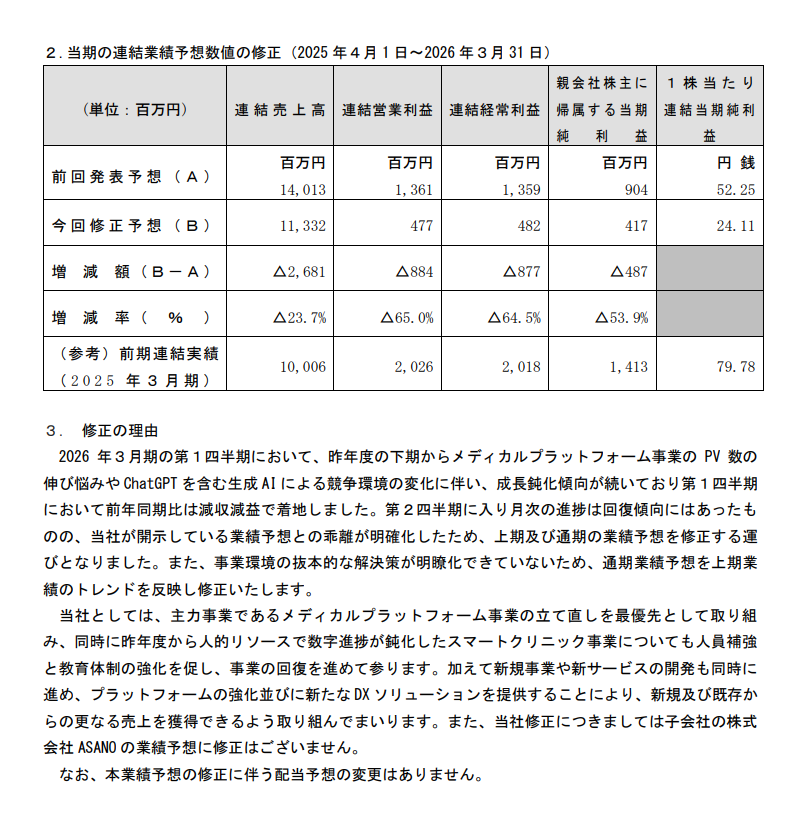 「メディカルプラットフォーム事業のPV数の伸び悩みやChatGPTを含む生成AIによる競争環境の変化に伴い、成長鈍化」