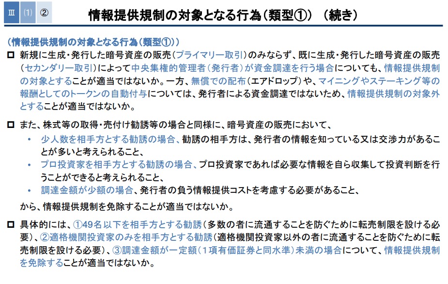 金融庁は9月29日、金融審議会「暗号資産制度に関するワーキング・グループ(WG)」の第3回会合を開催した。 会合では、金融庁担当者が事務局説明資料に沿って今後の規制方針を説明し、暗号資産(仮想通貨)のホワイトペーパーをはじめとする発行者の情報開示について、規制を整備する方向性を示した。 説明では、中央集権的な管理者が存在する暗号資産について、当該管理者が販売によって資金調達を行う場合を情報提供規制の対象とすることが適当であるとされている。 これは、ICO(Initial Coin Offering)やIEO(Initial Exchange Offering)際に投資家へ提示されるホワイトペーパー等の情報提供文書を念頭に置いた議論である。 今回の提案の背景には、これまでの会合での議論がある。第2回会合(9月2日開催)では、委員の一人である京都大学の岩下直行教授から、国内のIEO案件の実績が問題視された。 同教授は、多くの案件が公募価格を大きく下回り投資家に損失を与えている現状を「壊滅的」と指摘し、安易に金商法の枠組みへ移行することに慎重な意見を述べていた。 この情報提供の実効性を確保するための方策として、「発行者や暗号資産交換業者により作成される情報について、虚偽記載や不提供への罰則や損害賠償に係る民事責任規定等を設ける」ことが考えられると明記されている。 また、「虚偽記載等があった場合には、国内の全ての暗号資産交換業者での取扱いを停止できるような措置を設けること」が考えられるとも続けられた。 この提案は、これまでプロジェクトの理念や計画を示す側面が強かったホワイトペーパーに対し、その記載内容の正確性を法的に担保させることを意図している。 虚偽記載があった場合に罰則や民事上の損害賠償責任が問われることで、発行者が開示する情報は、株式発行における目論見書のように、法的な重みを持つ文書へとその性格を変えることになる。 参考資料:https://www.coindeskjapan.com/316487/ contents ●テレグラム始めました! https://t.me/joinchat/F-7ftRCH5u_8J7k2JUM1rw ●無料でLINE@で有益情報を随時流しています。 https://lin.ee/1rhkgzo ●過去の記事 http://ripple.2chblog.jp/ ■トレードするならバイナンス! https://www.binance.com/ ■yobit net https://yobit.net/en/ ●テレグラム始めました! https://t.me/joinchat/F-7ftRCH5u_8J7k2JUM1rw ●無料でLINE@で有益情報を随時流しています。 https://lin.ee/1rhkgzo ●過去の記事http://ripple.2chblog.jp/ ■トレードするならバイナンス!https://www.binance.com/■yobit nethttps://yobit.net/en/ Source: Rippleリップル)仮想通貨情報局 投稿ナビゲーション 【緊急】XでやけくそGiveawayがバズり中、リポスト&いいねで仮想通貨を手に入れるチャンス到来wwwwwwwwww 【悲報】ウクライナ人の富豪男性(32)、仮想通貨の下落で全て(45億円)を失い、ランボルギーニの中で銃自殺する