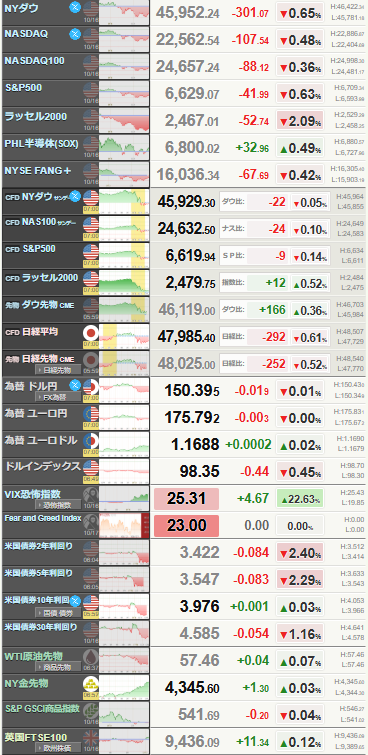 1: 稼げる名無しさん :2025/10/17(金) 06:48:16.75 ID:bZ9CGQSj9 16日の米株式市場でダウ工業株30種平均は続落し、前日比301ドル安の4万5952ドルで終えた。保有する債権に疑義が生じたとして大手地銀が相次ぎ取引先を提訴し、米銀の信用不安が強まった。破綻した米自動車部品メーカー、ファースト・ブランズ・グループ(FBG)などを巡る問題は尾を引いており、市場は信用リスクの拡大に疑心暗鬼になっている。 https://www.nikkei.com/article/DGXZQOGN16D1X0W5A011C2000000/ 1001: 以下名無しさんに代わりまして管理人がお伝えします 1848/01/24(?)00:00:00 ID:money_soku 10月1日に修正した金の年内4200ドル~4500ドルの予想、もっと上でもよかったんでは? これでも強気すぎると周りからは何度も言われたんだがな。。。 ただ本当に予想の上限を突破しそうな勢いだ。 document.getElementById(‘kznott2frame’).onload = function() { try { const contentHeight = this.contentWindow.document.body.scrollHeight; this.height = contentHeight; } catch (e) { console.error(“error”); } }; 続きを読む Source: 稼げるまとめ速報 投稿ナビゲーション X荒れる「維新に出し抜かれダサい」「判断遅い!」玉木代表、維新に騙された愚痴配信が炎上 総理と言われ時の人も→グズグズして終了 【SIer】未経験エンジニアやが質問ある?