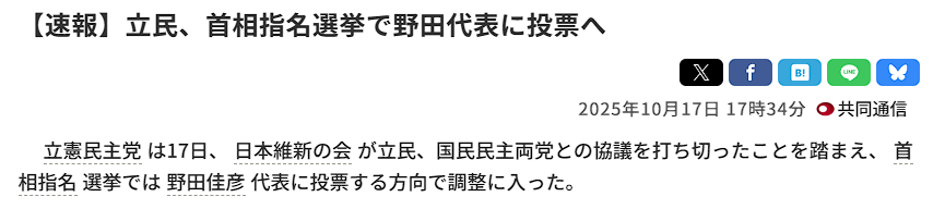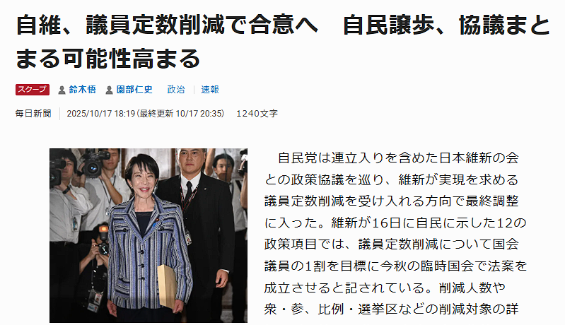 自民が議員定数削減受け入れとの毎日報道、関係者談でかなり眉唾。立維国協議の打ち切りも、「野党連携が難しい」ためで、自維合意が近いためではない。企業団体献金も消費税ゼロも未合意。ただ裏では立民が野田指名を固めた模様(=共同)。どちらも事実なら高市首相確定で材料としては一旦終了。