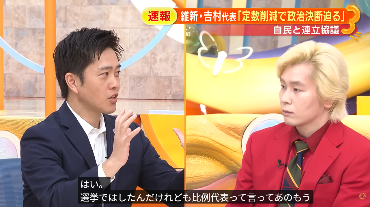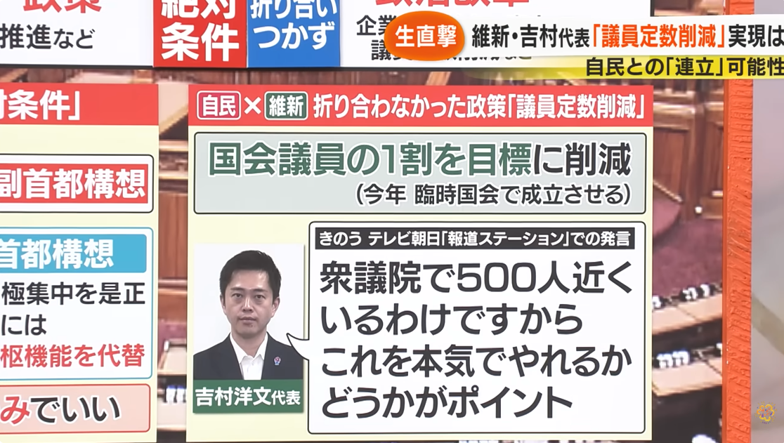 維新・吉村代表が自民との連立の条件として挙げた議員定数削減(国会議員の1割を目標に削減)は、小選挙区では無く、比例の方を削減したいとの事。