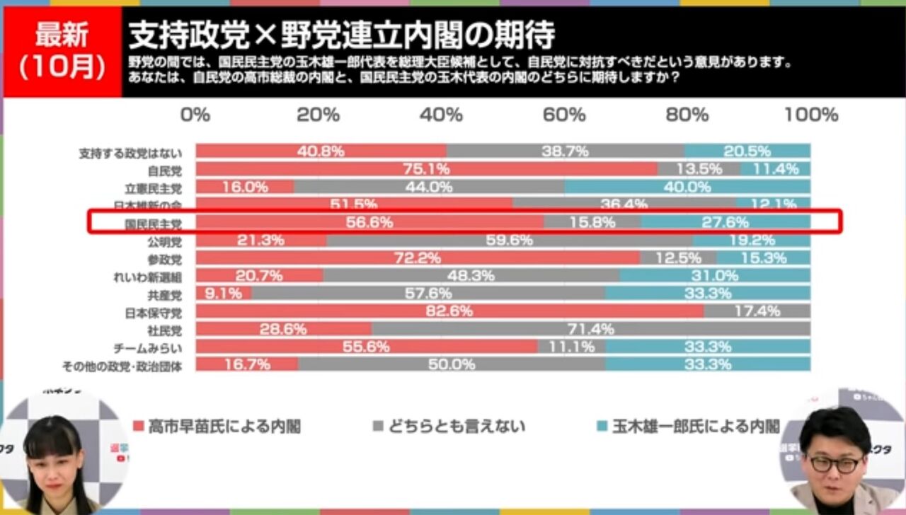 先の選挙で一時的な人気があったと自認しているけど、次の選挙で安定票がほしいがために公明と組んじゃって結局ただの野党だった感のある国民民主()
