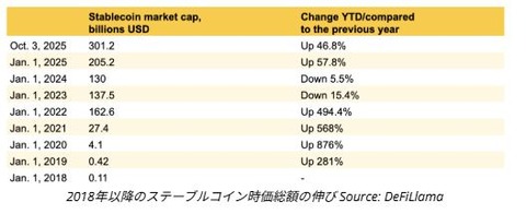 法定通貨やコモディティに連動する仮想通貨であるステーブルコインの時価総額が初めて3000億ドルを超え、採用拡大の大きなトレンドを浮き彫りにした。 DefiLlamaによると、時価総額3000ドルの大台は2025年10月3日に到達し、年初来で46.8%の成長となった。 3000億ドルという水準を突破したことで、ステーブルコイン市場は新規発行ラッシュや競争激化が進む中、2024年を上回る成長ペースに入る可能性が高まっている。 「この節目は、今構築しているインフラを数兆規模にスケールさせる必要があることを思い出させる。なぜなら市場はその方向に進んでいるからだ」とUSDT0共同創設者のロレンツォ・R氏はコインテレグラフに語った。 昨年の成長再現には230億ドルが必要 昨年の58%の成長に並ぶためには、年末までにさらに230億ドルの増加が必要となる。ただし第3四半期だけで400億ドルが市場に流入しており、アナリストは十分に達成可能性だと見ている。 過去にはさらに急速な拡大が見られた。ステーブルコイン市場は2019年に876%急増し、4億ドルから41億ドルに拡大した。パンデミック期にも成長は続き、2020年に568%、2021年に494%増加したが、2022年と2023年には初の大きな縮小を経験した。 エセナのUSDeとソラナが大幅成長 2025年の成長を牽引したのは主にテザーのUSDT、サークルのUSDC、そしてエセナ・ラボの利回り付きステーブルコインUSDe(USDE)だった。 RWA.xyzのデータによれば、USDTとUSDCが依然として市場を支配している一方で、USDeは市場シェアの伸びが最も大きく、1月の約60億ドルから10月には150億ドル近くに急増した。 ネットワーク別ではイーサリアムが引き続き優勢で、ステーブルコイン流通供給は1710億ドルに達した。 ただしイーサリアム上のステーブルコイン供給が今年44%増にとどまる一方、ソラナ上のステーブルコインは48億ドルから137億ドルへとほぼ70%増加した。 アービトラムとアプトスでもそれぞれ約70%、96%と顕著な成長が見られている。 メインストリームでの採用への期待 EarnOS創設者のフィル・ジョージ氏は、3000億ドル突破は重要な節目だが、より注目すべきはその成長トレンドだと強調した。 「供給量は2年で倍増し、来年にはさらに倍増する可能性がある。ストライプ、サークル、テザーが独自のレイヤー1ブロックチェーンを構築し、ペイパルはすでに独自のステーブルコインを発行している」と述べた。 「来年には取引高が100兆ドルに達し、供給も6000億ドルまで増えるだろう。Visaのような決済大手から新たなステーブルコインが登場することも確信している」とコインテレグラフに語った。 CMTデジタルのリサーチ責任者アリアン・シェイカリアン氏も同様の見解を示し、3000億ドルは「成熟の指標」ではあるものの、さらに重要な節目が控えていると述べた。 シェイカリアン氏によると、5000億ドルはメインストリーム統合の段階を示し、1兆ドルには30年末までに到達する見込みで、その時点では企業財務や消費者決済にステーブルコインが広く浸透することになる。 「長期的には、アマゾンやウォルマートのような企業が独自トークンを発行するか、ステーブルコイン決済を採用した時点で、消費者の金融基盤が根本的に変わるだろう」と同氏は指摘した。 参考資料:https://jp.cointelegraph.com/news/stablecoins-300-billion-market-cap-47-growth-ytd?utm_source=rss_feed&utm_medium=rss&utm_campaign=rss_partner_inbound contents ●テレグラム始めました! https://t.me/joinchat/F-7ftRCH5u_8J7k2JUM1rw ●無料でLINE@で有益情報を随時流しています。 https://lin.ee/1rhkgzo ●過去の記事 http://ripple.2chblog.jp/ ■トレードするならバイナンス! https://www.binance.com/ ■yobit net https://yobit.net/en/ ●テレグラム始めました! https://t.me/joinchat/F-7ftRCH5u_8J7k2JUM1rw ●無料でLINE@で有益情報を随時流しています。 https://lin.ee/1rhkgzo ●過去の記事http://ripple.2chblog.jp/ ■トレードするならバイナンス!https://www.binance.com/■yobit nethttps://yobit.net/en/ Source: Rippleリップル)仮想通貨情報局 投稿ナビゲーション Ripple、新たに「UCバークレー デジタル資産センター」設立 銀行員 「普通のサラリーマンでも40才過ぎたら金融資産3000~4000万円くらい持ってる人多いですよ」