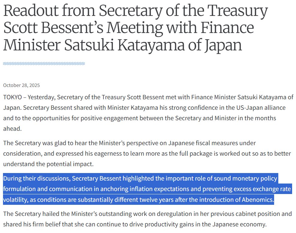 米財務省リードアウトには「ベッセント長官は、アベノミクス導入から20年たって状況が大きく変化していることからも、インフレ期待を安定させ、為替の過度な変動を防ぐ上で、健全な金融政策の策定とコミュニケーションが果たす重要な役割を強調した」と。利上げ早よってこと?