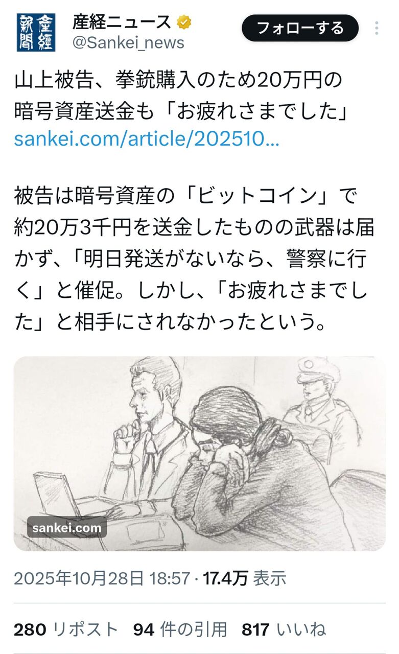 【悲報】山上被告、本物の拳銃購入の為にビットコイン20万円送金も騙し取られていた模様… 2025年10月29日 仮想通貨・暗号通貨・暗号資産ニュー 1: コイン速報がお伝えします 2025/10/29(水) 09:25:23.589 ID:09KkgCIu0 これはかわいそう 続きを読む Source: コイン速報 | 仮想通貨・暗号通貨・暗号資産ニュース 「$750億の暗号通貨犯罪が、ブロックチェーンと法執行機関の協力を促進」 コメントをどうぞ 返信をキャンセルする。 名前 (必須) メールアドレス(公開されません) (必須) ウェブサイト コメント送信 Δ