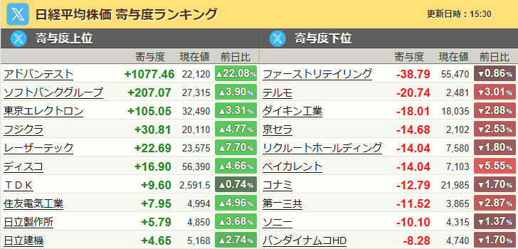 そいやあ25年前(2000年)に突如日経平均採用銘柄の大量入れ替えを発表して、日経大暴落、ITバブルの終焉を迎えたわけだが、その時に新規採用されたのがアドバンとか東京エレクだったよなあ。
