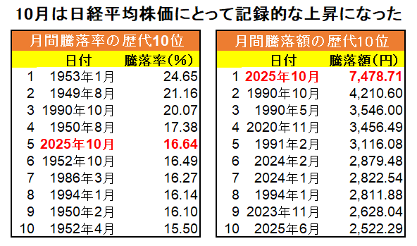 10月の月間上昇額は7478円で歴代で断トツ。これまで首位だった1990年10月(4210円)を大幅に上回りました。… pic.twitter.com/GZlozvAHE2