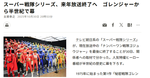 戦隊ってインフラだと思ってた。水とか電気と同じ。 — 倉持キョーリュー (@kyoryu_kuramo) October 30, 2025 https://www.asahi.com/ テレビ朝日が朝日新聞の取材に対して、「今後の編成についてお答えしておりません」とコメントしているのか… — てつぼう (@radiantironbar) October 30, 2025 スーパー戦隊シリーズの終了、一応は理解するけど、「これが最終作」と言えるものを作らずに単に「今の作品で終了」と言われると「もうちょっとなんかあるやろがい」って気持ちになるぜ…… — 九条水音 (@mizune) October 30, 2025 最終戦隊オワリジャーみたいな名前にしてぶっ飛んだ作品にして最後の花を咲かせるぐらいやっても良かった。 — あれっくす (@NStyles) October 30, 2025 スーパー戦隊というブランド名だけが終わるのか、それに変わる何かが始まるのか、それともニチアサの特撮枠そのものが一つ潰れるのかで話がだいぶ変わってくるよ。 — まなしな (@soundwave0628) October 30, 2025 あくまでも「ニチアサで放送される4クールの新作番組」が終わるだけで周年記念作品等の過去作の供給はこれからもあるのかもしれんけどそれでも「新規作品の供給があり続ける」という構図は安心感がデカいし実際ブランド維持に最重要なもんだから精神的にかなりクるものがある — 3ドライ (@ThreeDry_G) October 31, 2025 特撮知らない層には『スーパー戦隊終了』の重みがいまいち伝わっていなさそうなので、図示してみました。特撮ヒーローの世界で万世一系を保っていた唯一の王朝がついに断絶したことでファン界隈に衝撃が走っているわけです pic.twitter.com/Sd4x8IoLYR — Omizan Sakamoto (@omi_info3) October 31, 2025 スーパー戦隊は毎年同じコンセプトの番組を4クール途切れなく味変させて半世紀出せるのがだいたい異常だったなと思う — 日尭 太 良阝 (@gyo_taro) October 30, 2025 確かに戦隊でも近年はメンバー同士がライダーのようにいがみ合い戦う戦隊もあるし、もうロボが出るくらいしか戦隊とライダーの違いがないんだよね。そのロボですら出番は試行錯誤の名のもとに削られたりロボじゃない存在にされている訳だし — アルトゥン (@aurum08) October 30, 2025 テレ朝的にはもう戦隊の放送枠を終了させたいとして、東映とバンダイに戦隊を終了させるメリットってあるのか? — 事業部長わたなべ (@x3318jp) October 30, 2025 テレ朝は90年代も子供向け番組を終了 & 集約する流れがあったけど(ガンダムもそれで1回終わってるし)、今の地上波TVはその比じゃなくて、極限まで高齢化してるからなぁ 配信メインにして、バンダイと東映のみで、戦隊新作を世界に売っていく道も無くはないかもだけど、玩具の流通は大変だろうなぁ — 矢新 (@yagami146) October 30, 2025 うーん、たしかにこれ見ると仮面ライダーは安定してるけど戦隊は売上よろしくないな pic.twitter.com/gJh3oe5ibv — 特撮の棚(海老の人🦐) (@Tanasan77) October 30, 2025 戦隊の売上がトッキュウジャー以降100億越えてないむしろ徐々に下がってきては微増程度しかしなくなってたから毎年ヒヤヒヤしながら決算見てたわそもそもライダーと一緒に放送して玩具売るのはまず不可能に近いよなビジネスとして破綻してる pic.twitter.com/wGqfBiZmDJ — \ おは / \\ ヴォー! // __, -、ー 、 (@wingget9xa) October 30, 2025 スーパー戦隊が終わる件、東映はお金が入るからやりたい、テレビ朝日は数字が取れるからやりたい、でもバンダイは儲からないからやめたい(お金をこれ以上払いたくない)と言うわけで、民放は広告放送である以上、媒体効果がなければどんな優れたコンテンツでも製作する事はできないと言うお話し。 — ello!Project (@ElloProject) October 31, 2025 時代劇がなくなり、スーパー戦隊もなくなると、大人数の殺陣というものがなくなってしまう。 — 中野貴雄とギャルショッカーズ🐤 (@galshocker) October 30, 2025 近年は特撮出身俳優の活躍が目立つ中で、その登竜門が物理的に狭まるのは少し寂しいですね — 日尭 太 良阝 (@gyo_taro) October 30, 2025 マスコミ「スーパー戦隊放送終了!」 外野「売り上げ不振、予算、出演者が」 オタク「出演者のやらかしは、バイオマンからあったしライダーもウルトラマンも放送していない期間があった!!東映公式からの発表を待て!!」 東映「今日は、ラッキューロの誕生日あと、我が社を騙る詐欺に注意」 — ユーマ(🍆×無限) (@UMA00683068) October 30, 2025 というかデマなら早々に東映が声明出すなきゃいけないのに「我々から言えることはありません」の時点でもうデマってことはないでしょ — 祭祭祭 (@fffestival913) October 31, 2025 これで「来年からハイパー戦隊シリーズになります!!!」ってことだったら各種報道機関を巻き込んだ茶番すぎるから、多分”ガチ”ってことだよねこれ?(えぇ…) — 捨てライム (@lime_battou) October 30, 2025 スーパー戦隊が終わったら、何年かしたあとでどっかの特撮おじさんが『シン・ゴレンジャー』作るんでしょ。 — あれっくす (@NStyles) October 30, 2025 まだゴジュウジャーが永遠に続くという可能性もある。 — 相川啓太 (@kta_k) October 30, 