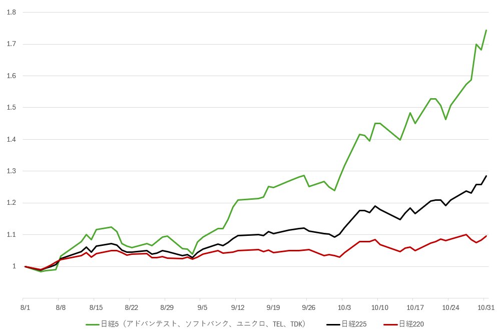 試しに日経平均構成率上位のアドバンテスト・ソフトバンク・ユニクロ・TEL・TDKを日経5、それ以外を日経220として、8月1日を1とした変動率をグラフにしてみたら、思ったよりひどいことになってしまった。まさに日経5にあらずんば株にあらず… pic.twitter.com/1krG53yf6l