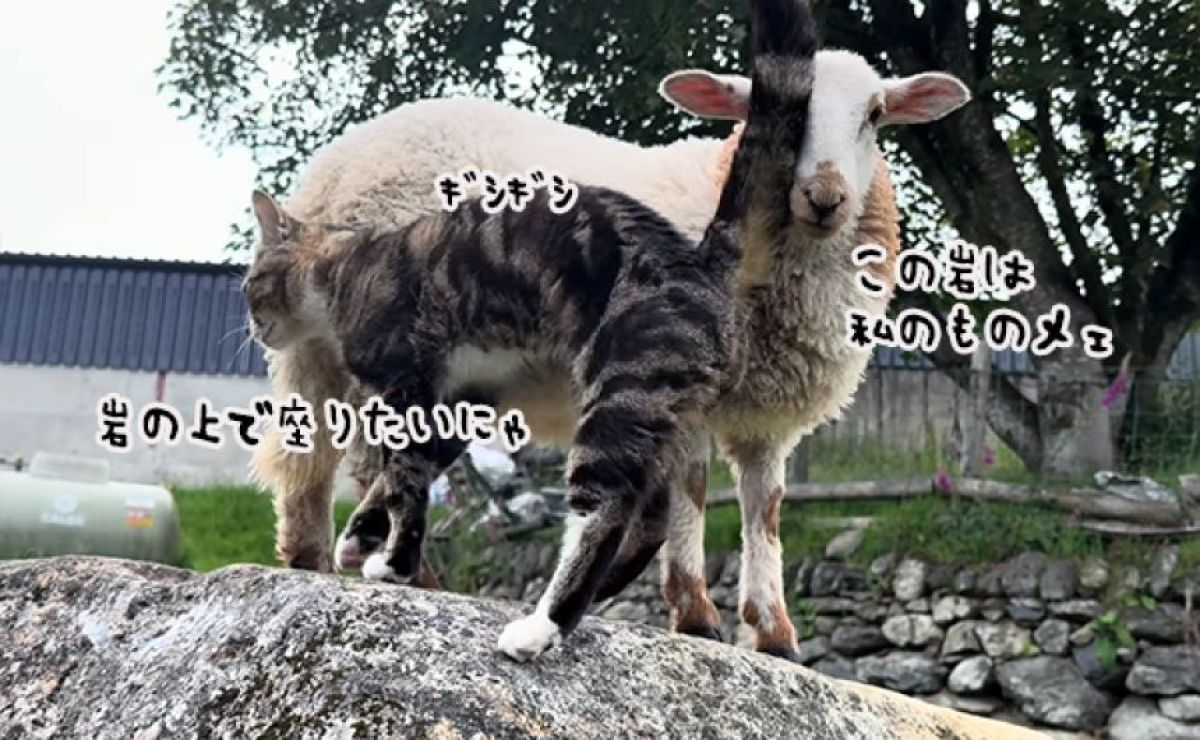 イギリスの自然豊かな農場には、羊や猫、犬たちが仲良く暮らしている。 その敷地内にある1つの岩を巡って、抗争が勃発した。特に羊のフローレンスはこの岩を独占したい気持ちが強く、猫が登ってくると頭突きで追い払うのだ。 だが猫も、黙って押し出されているわけではない。あの手この手を使って岩に座ろうとする。 元々は仲が良い両者なので、遊びの一環なのだろうが、椅子取りゲームさながらの展開に思わずフフッと笑ってしまう。 続きを読む… ▼あわせて読みたい ・羊の皮を被った猫?くるくる巻き毛の「セルカークレックス」の子猫 ・こういう動画だけ見ていたい。とにかく仲が良い猫と羊 ・とっても仲良し猫と羊。ウクライナの動物園で「2025年のベストカップル賞」を受賞 ・ウール100%のベッドで眠る猫。羊毛のお手入れもしっかりにゃ ・病気の子羊の看病をかって出た猫、両者は大親友となり猫の羊化が進む この記事のカテゴリ:動物・鳥類 / 動画 Source: カラパイア 投稿ナビゲーション 【画像】チョコレート、高級品になる 日本人さん、お金持ち家の大学生娘にSNSで嫉妬しブチギレ発狂していた…