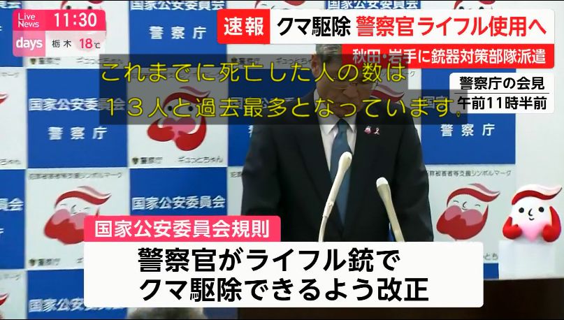 対クマ戦線に自衛隊と警察が参戦するそうで。死傷者が出るでしょうが仕方ないな。