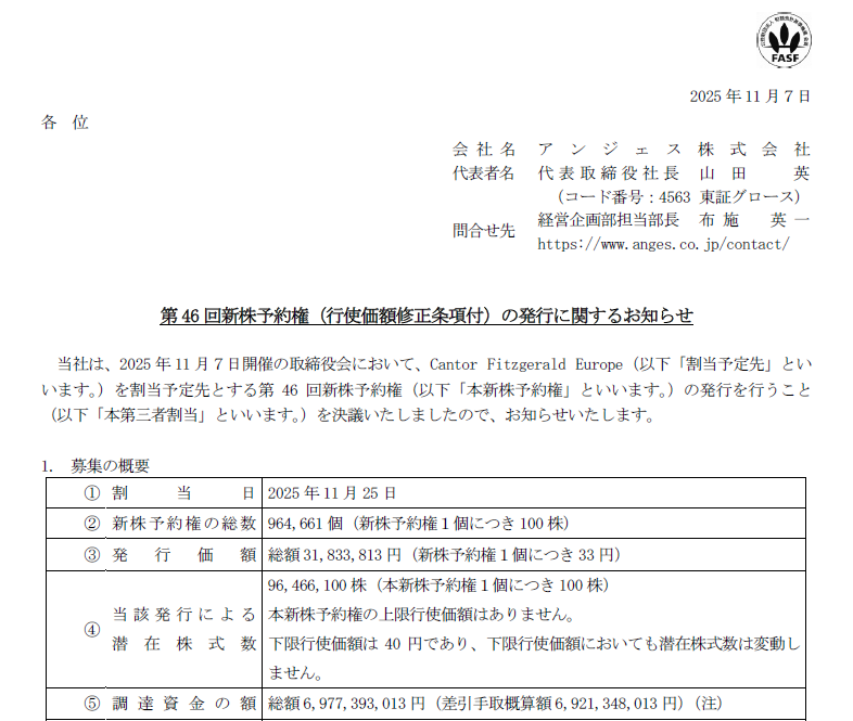 アンジェス、第46回MSワラント発行、9646万株分、下限行使価額40円、前日終値90%に修正、慢性動脈閉塞症のHGF遺伝子治療薬のグローバルでの製品価値最大化のための研究開発費用等に充当、Cantor Fitzgeraldに割当