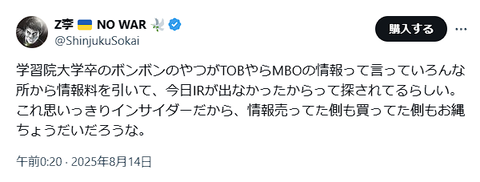 MBOの『インサイダー情報』を販売して相場操縦してたやつがいるなら逮捕で、そんな奴がいなかったとしたら偽情報で暴落トリガー引いた奴が逮捕、それで頼む — もちベーコン (@qxqxqxaquas) August 14, 2025 パリミキまじでやるんやw — スー🦭 (@jkerouac1117) November 12, 2025 2025/11/12 パリミキホールディングス 株式会社ルネットによる株式会社パリミキホールディングス(証券コード:7455)の株券等に対する公開買付けの開始に関するお知らせhttps://www.paris-miki.com/「公開買付者は、本日現在、当社株式を26,243,699株(所有割合45.07%)所有する当社の親会社及び主要株主である筆頭株主」「当社の代表取締役会長である多根幹雄氏は公開買付者の代表取締役を兼務」 パリミキ、1株581円でMBO — ありゃりゃ (@aryarya) November 12, 2025 パリミキってZ李が言うてたやつよな。結局あってたんか。 — +65 Ability Power (@Needle3LargeRod) November 12, 2025 ※メガネ屋のパリミキ、学習院大卒の何者かがガセネタで株価を吊り上げさせて梯子を外し逃亡したとの真偽不明の怪しい情報が出回る(2025/08/14) まさかの学習院グループのインサイダー勝ち? — ありゃりゃ (@aryarya) November 12, 2025 火のあるところだったのか — 確認用 (@news9111) November 12, 2025 やさしいせかい pic.twitter.com/7QUVZuvr5s — あろれの抜け殻 (@alorest_b) November 12, 2025 https://kabutan.jp/stock/chart?code=7455 ※インサイダー情報が出回った2025年8月上旬とMBO公式発表直前に不自然な値動き パリミキ、あの時の買いとか不正じゃなくて、なんか意味のある買いだったのかな? 怖いんだが。。 — アルファるふぁ (@aru_pha) November 12, 2025 581円なら8月高値で買った人も救われる — 確認用 (@news9111) November 12, 2025 寄りから買われてたのも学習院? どこまで学習院なの!?(錯乱) — アルファるふぁ (@aru_pha) November 12, 2025 ほんとふざけんなよwwwww — みかん (@M6Yv0) November 12, 2025 パリミキの件は色眼鏡で見られるな — DON (@D0N12345) November 12, 2025 株式市場、犯罪者しかおらん — 新垢メタスラ(ベンツマン@株式板) (@Benzman_TAKE2) November 12, 2025 学習院グループがちゃんと逮捕されて名前が出てきて、学習院と本当に関係があるのかが知りたい。 — saku (@sakusaku_kabu) November 12, 2025 Source: 市況かぶ全力2階建 投稿ナビゲーション 【悲報】自動運転、やっぱ駄目っぽいww 【悲報】世界中の極右政治家さん「移民」が必要だと訴え支持者を裏切ってしまうwwwww