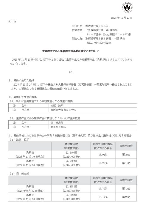 ランダム商法が憎い。くじも嫌い。欲しいものが手に入らないのも、自分が欲しくないもの全てがハズレになるのもとても嫌。私が欲しいのは商品であって、くじをひくことが目的じゃない。この商品はランダムでいこうと決めた人の給料を毎月ランダムにして欲しいと願っている。 — スガミ (@sugami_stage) July 16, 2024 グッズ積むためにお金持ちになりたいと思うことは無いけど、運営の筆頭株主になってランダム商法廃絶させるためにお金持ちになりたいと思うことはある — 骨牌🕊11/16🌸東6 ユ64ab (@karuta_x) September 16, 2025 スクー、池原諒平氏が筆頭株主に pic.twitter.com/gk2bGnAhXs — ありゃりゃ (@aryarya) November 27, 2025 https://corp.schoo.jp/ir/news/ スクー、ついに会社社長の持ち分より多くなってるw — もっち (@motti1234) November 27, 2025 無限ナンピンで筆頭株主すげーw — るんば💰株 (@rumba_kabu_) November 27, 2025 https://disclosure2.edinet-fsa.go.jp/ 単価平均752円で無限ナンピンしてる人が筆頭株主になってS高って…(´・ω・`) — ざら速(ザラ場速報) @ときどき仮想通貨 (@ZARASOKU) November 27, 2025 https://kabutan.jp/stock/chart?code=264A 大量保有報告書、筆頭株主変更で上がってるのでは無く、保有する目的に期待し買い増し — 昭和産の独り言「糸冬了」 (@LOVE_MARO_LOVE) November 27, 2025 「経営支配は目的としない」 ↓ 「外部事業会社との戦略的選択肢の検討を行うため」 無限ナンピンって出口どこになるんだ? — 大胆なブーツカット (@nijulou) November 27, 2025 Schooのどこにそこまで惹かれるのか全然わからんわ — グレ (@tsuneniroubai) November 27, 2025 https://www.youtube.com/ 投資家として生き残るコツは、絶対に負けられない戦いをしないことです — 山田 (@u2yamada) November 19, 2024 Source: 市況かぶ全力2階建 投稿ナビゲーション 【鰻】ニホンウナギ含むウナギ全種類を国際取引の規制対象にする案は「否決」 12月5日本会議で可決の可能性も 【相場】ECB理事会議事要旨も特に材料なく相場はほぼ横這い