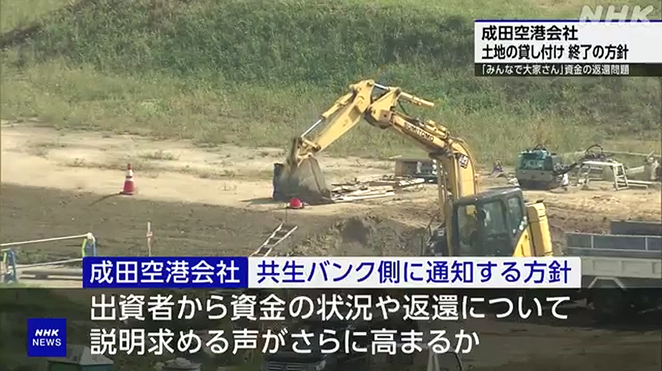 『成田空港会社が、事業者に工事を続ける資金力が確認できないなどとして土地の貸し付けを終了する方針を決めたことが関係者への取材で分かりました。』