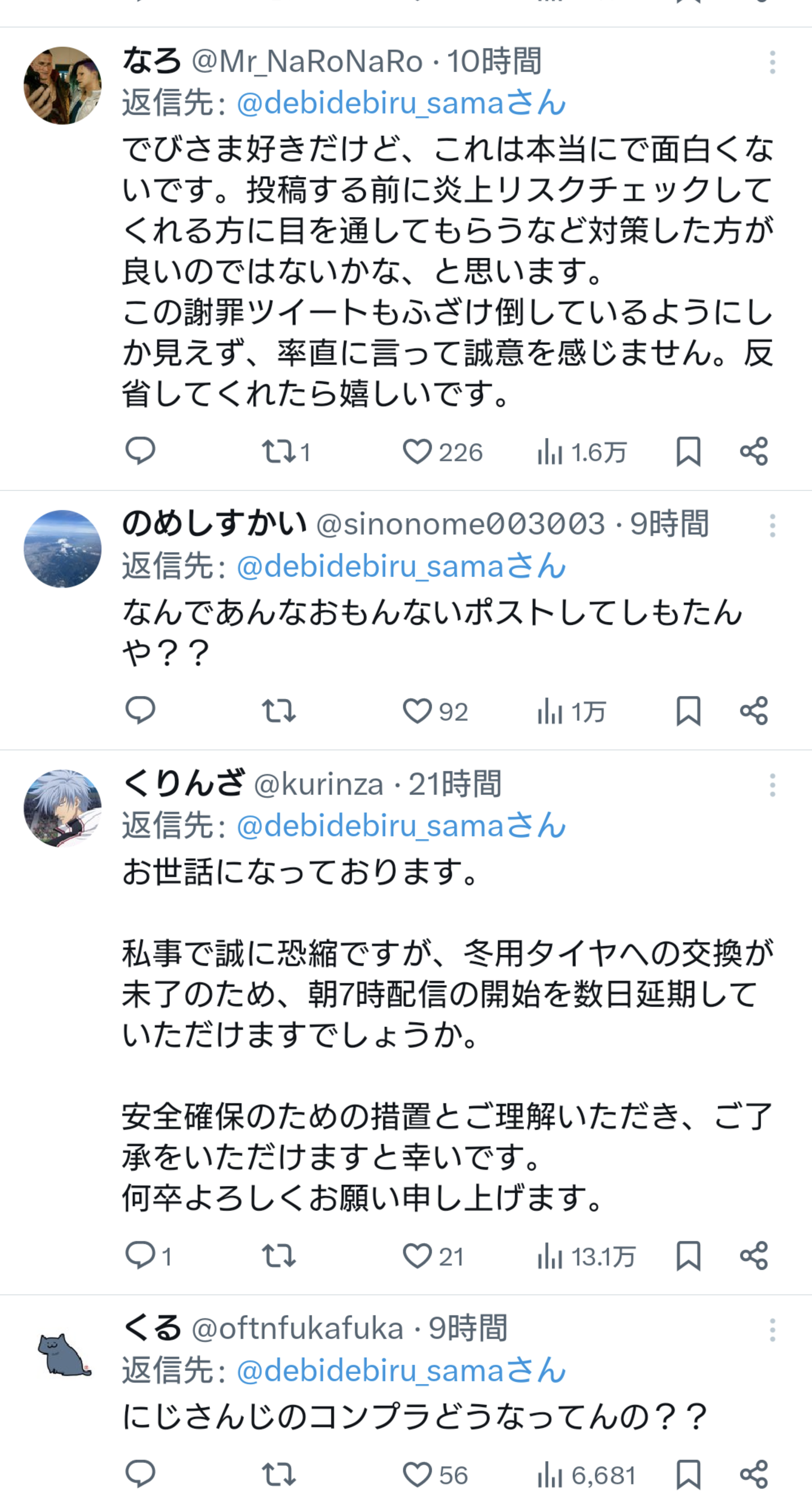【悲報】VTuber「朝7時通勤は大事なものを失ってる」発言で炎上 ←正直“朝7時通勤で心がすり減る”のは事実だよな 2025年11月29日 気になニュー 1: それでも動く名無し 2025/11/29(土) 09:28:49.37 ID:ZXgUj9jg0 その後、謎の追加ポストをして更に炎上 続きを読む Source: 哲学ニュースnwk 「【サッカー】まさかのレッドカード17枚! ボリビアサッカーで何が起こった? 約20名の警察官が介入、催涙ガスも使用される」 「豊洲市場で魚のあら30キロ窃盗容疑、居酒屋の女逮捕 「客に提供」」 コメントをどうぞ 返信をキャンセルする。 名前 (必須) メールアドレス(公開されません) (必須) ウェブサイト コメント送信 Δ