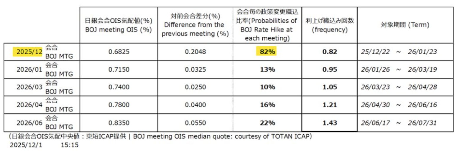 今日の植田総裁の講演と記者会見を受け、12月会合で日銀が利上げする確率は前週末の57%から82%に一気に高まりました。もう間違いないでしょう。