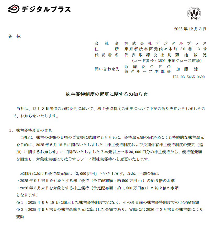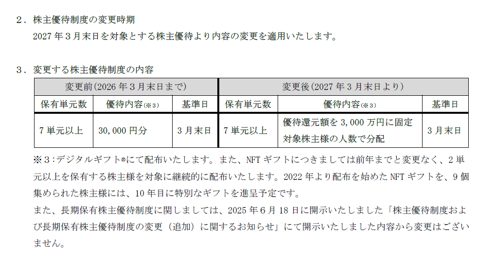 「7単元以上一律30,000円分の株主優待から、優待還元額を固定し、対象株主様にて按分するシェア型株主優待へと変更」