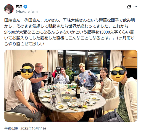 五味さんこういうの出るんやw — anne (@stupiddialog) October 11, 2025 俺もロックアップ無視して株売ってその後も大御所として居座りてえよ — ぶるー (@Lil_lair) December 4, 2025 ※モダリス大株主の片山晃さん、ロックアップ(売却禁止)期間中にうっかり保有株を全て売り抜けて大儲けしてしまいお詫び(2021/03/24) ちょっ。。五味さんネクセラ10%超えかよ。。凄すぎw — カルマンナニコレライン (@0nVs1SgBrEvhKUa) December 4, 2025 ネクセラ、五味大輔氏が買い増し、9.5⇒10.64% — ありゃりゃ (@aryarya) December 4, 2025 https://disclosure2.edinet-fsa.go.jp/ ※取得資金合計164億3557万円 CB条件変更を発表して下がった日に結構買い増ししてる — ありゃりゃ (@aryarya) December 4, 2025 ※既存の 2028 年満期ユーロ円建転換社債型新株予約権付社債の条件変更と一部買付けのお知らせ(2025/11/26) 玉璽に磨きがかかってる — エレフォロ (@elefolo2) December 4, 2025 約1000万株って10円で1億かw凄すぎる。 — Yuki (@yuki323) December 4, 2025 1兆の可能性があるならありだよな — UVP (@uvp_3636) December 4, 2025 そーせいって今800円なの…ファーーーw — 殺し屋 (@korotyan9314) December 4, 2025 https://kabutan.jp/stock/chart?code=4565※時価総額、741億円(2025/12/04) ネクセラ(旧そ)。五味さん冷静だなぁ。これが「金持ち喧嘩せず」って奴か。俺だったら5分に1 回くらいのペースで放送禁止レベルの罵倒をしちゃうだろうに — JJ^2 (@GoSoseiHeptares) November 19, 2025 ※ネクセラファーマ 第2回大株主対談 五味様(全編) 五味さんネクセラファーマで約90億円?含み損って日々どういう気分で過ごしてるんだろう…ベッティングの真っ只中だからあんま気にしてないんかなぁ — 新垢メタスラ(ベンツマン@株式板) (@Benzman_TAKE2) December 4, 2025 Source: 市況かぶ全力2階建 投稿ナビゲーション 【悲報】整形女さん、薄っすらとバカにされ始める AIの月額プランって入るの阿保と思う?